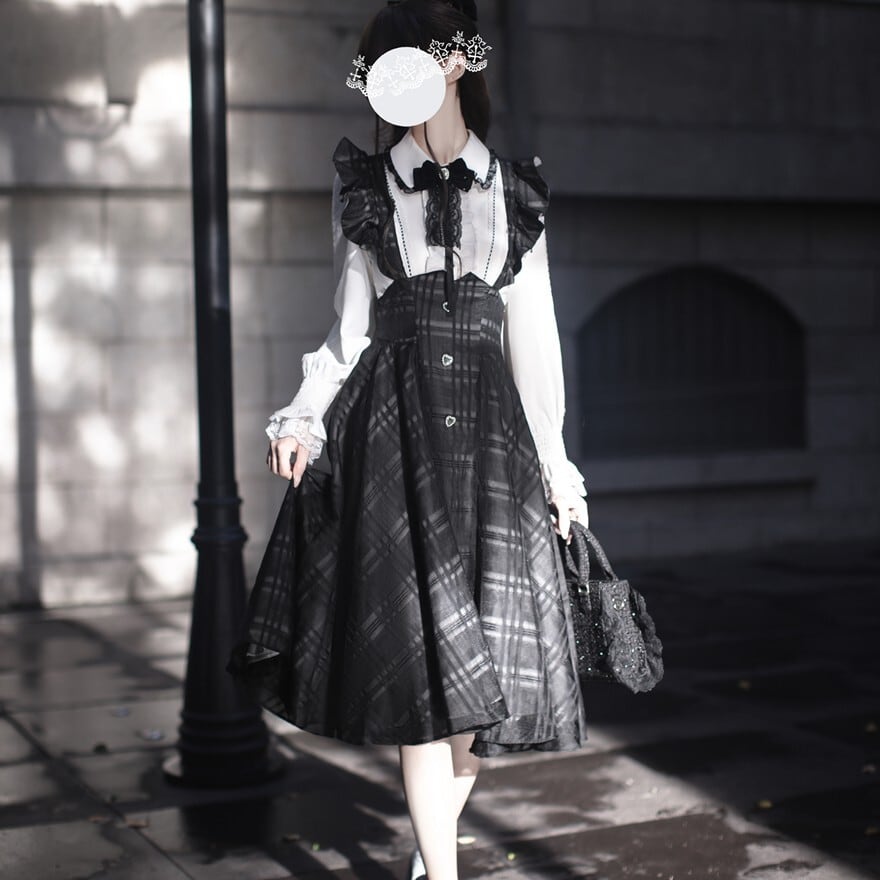 白のブラウスと、シックなモノトーンのチェック柄サスペンダースカート、そしてネックリボンがセットになったコーディネートです。