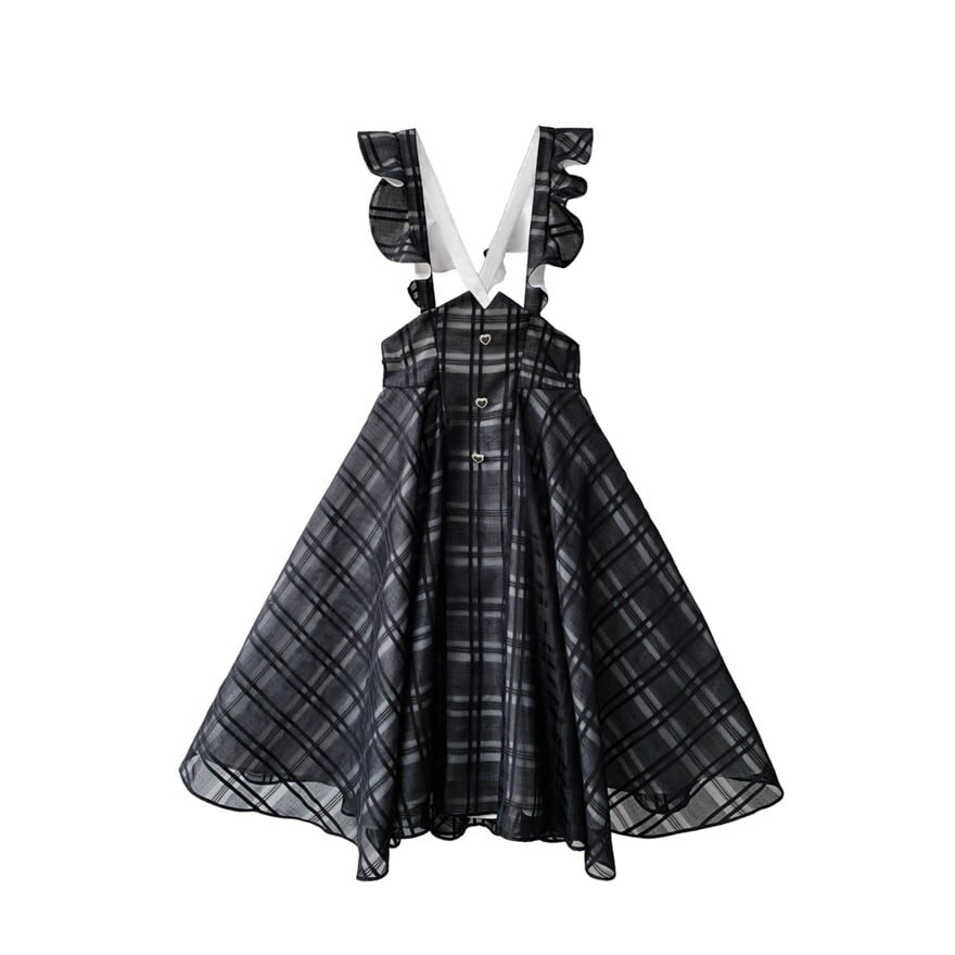 サスペンダースカートは、黒のチェック柄で、広がりすぎないAラインのシルエットがクラシカルな印象です。