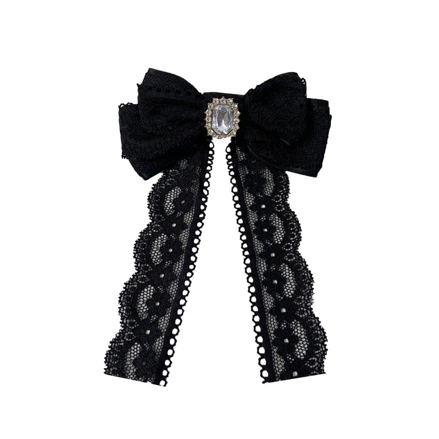 ブラウスは、襟元や袖にフリルやレースがあしらわれ、黒いリボンブローチがアクセントになっています。