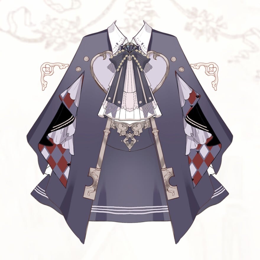 マントには、大きなハート型と鍵のモチーフがゴールドで描かれており、物語性を感じさせるデザインです。裏地や袖にはチェック柄が使われ、細部にまでこだわりが見られます。