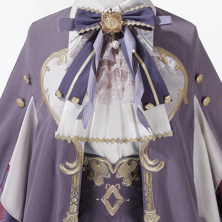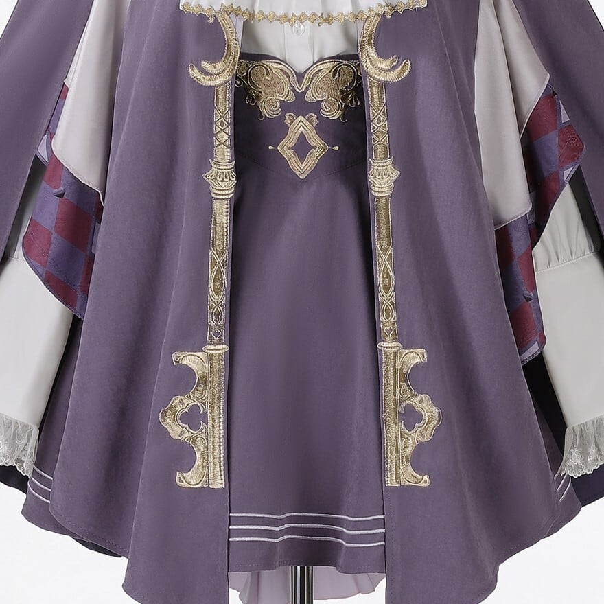 パープルを基調としたマント、白のブラウス、パープルのフレアスカートの3点セットです。