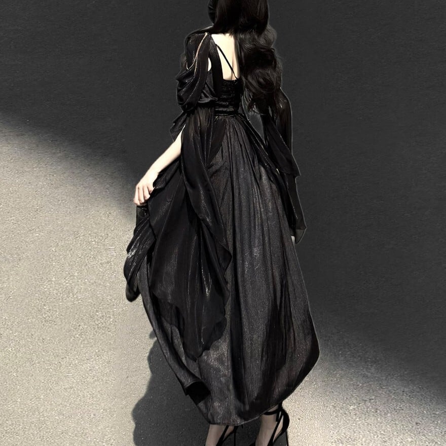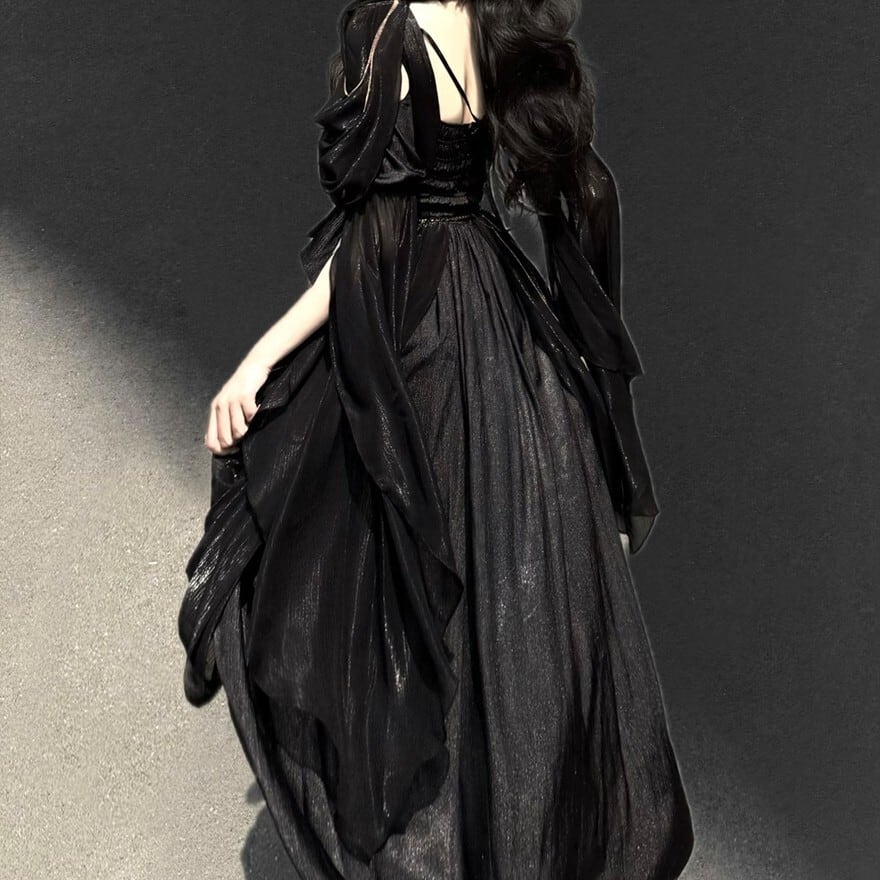 肩はストラップとオフショルダー風の構造になっており、袖はシフォンや薄手の布が流れるように垂れ下がったデザインで、ミステリアスでエレガントな印象を与えます。スカート部分もゆったりとしたドレープとボリュームがあり、動きに合わせて優雅に広がります。