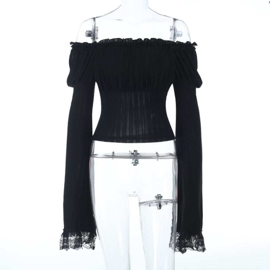 シックでありながらも、レースのディテールとオフショルダーのデザインが華やかさと妖艶さを添えるブラウス。