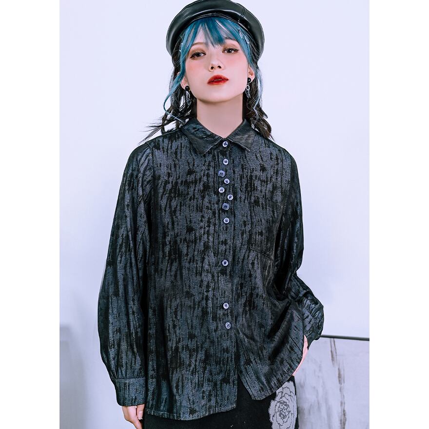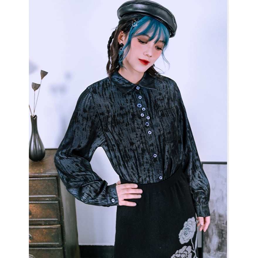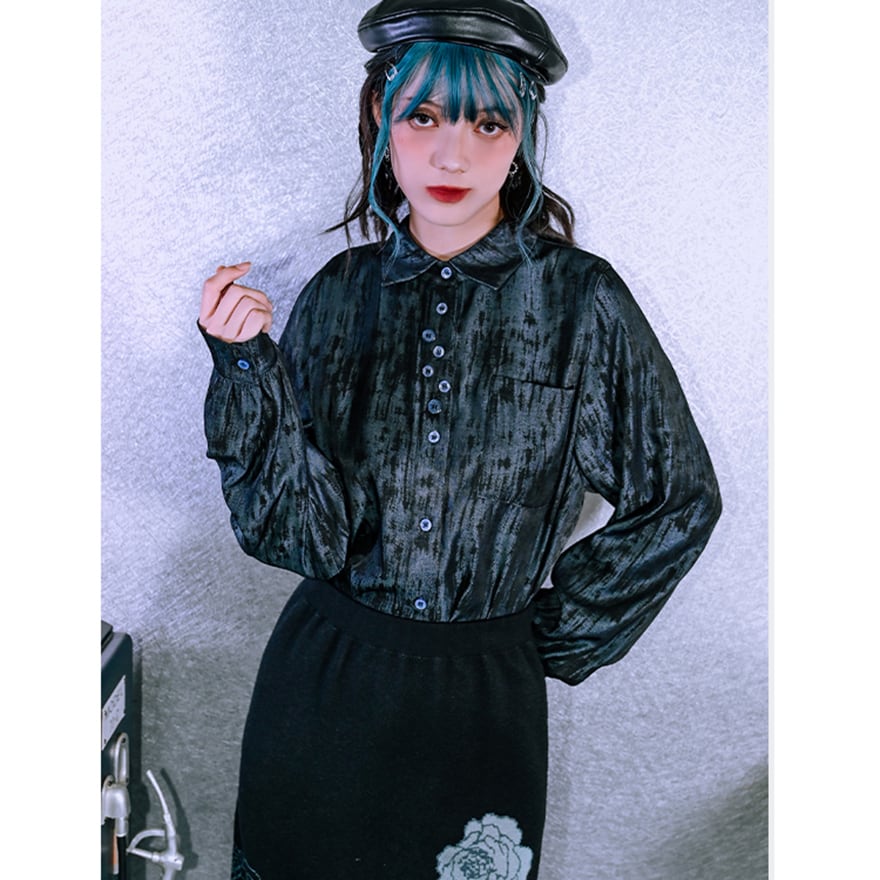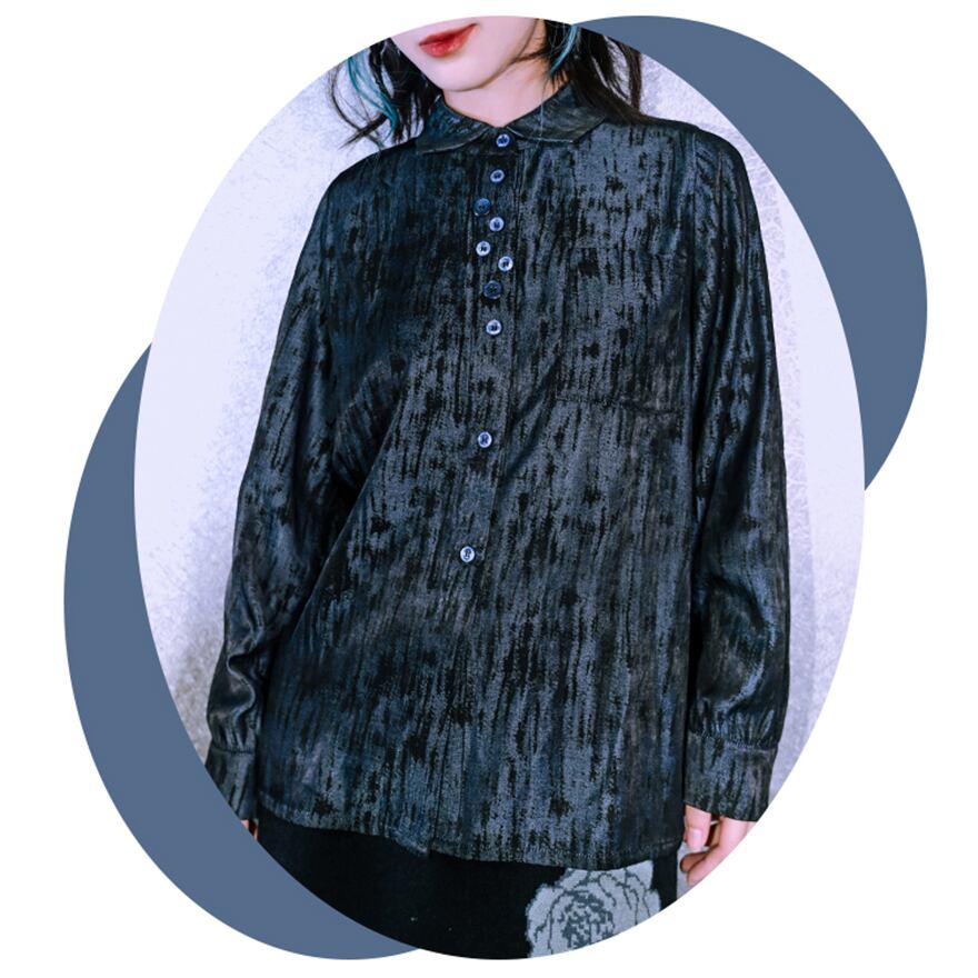 独特のブラッシュ加工のようなテクスチャが目を引く、中華ゴシックテイストの長袖シャツです。
