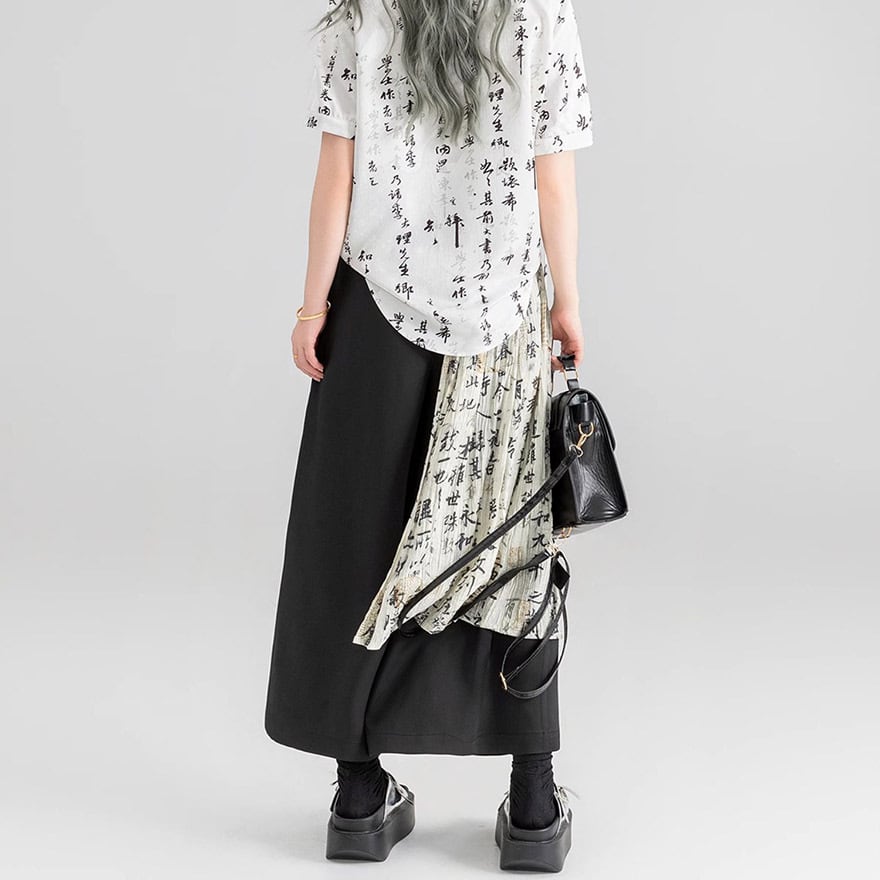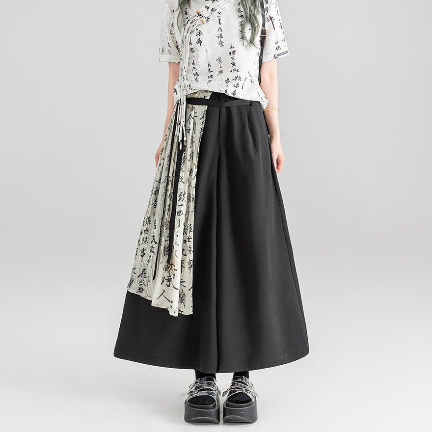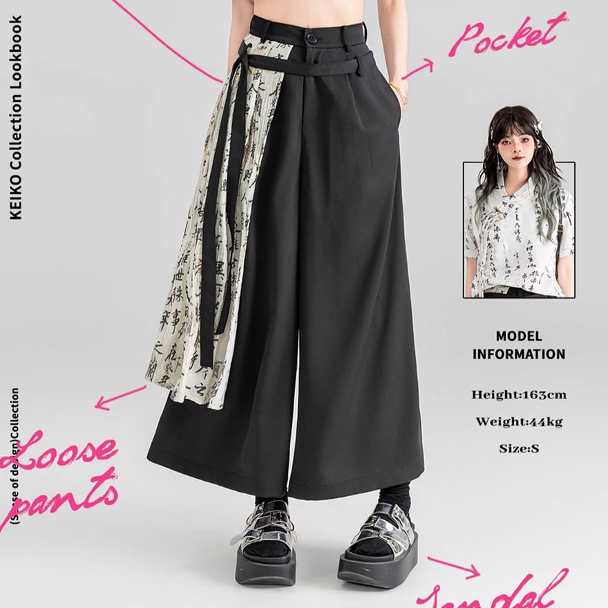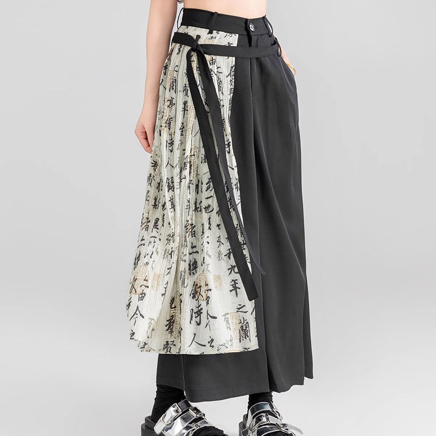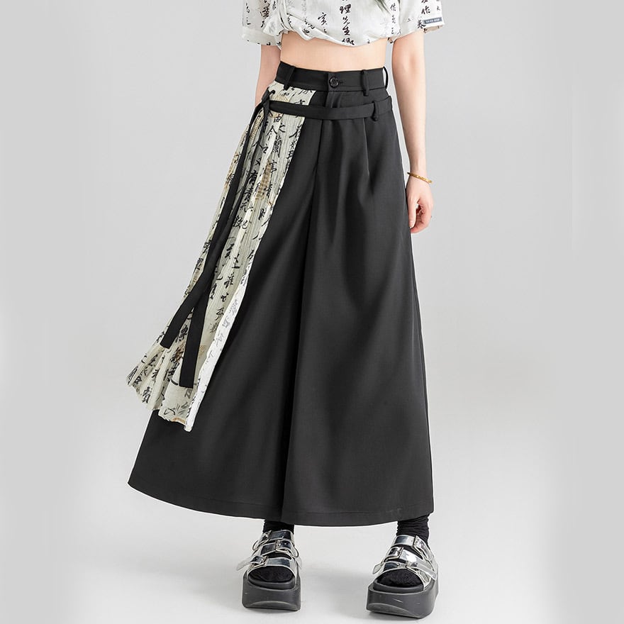 チャイナ風 ワイドパンツ プリーツ レイヤード スカート風 KEIKOシリーズ 漢字プリント