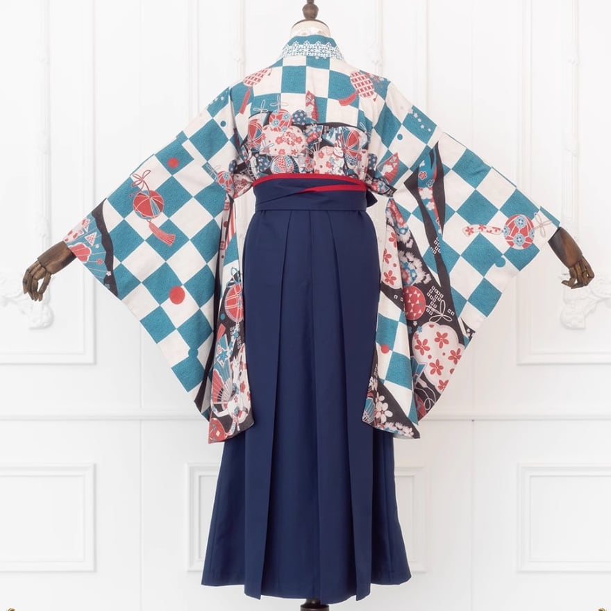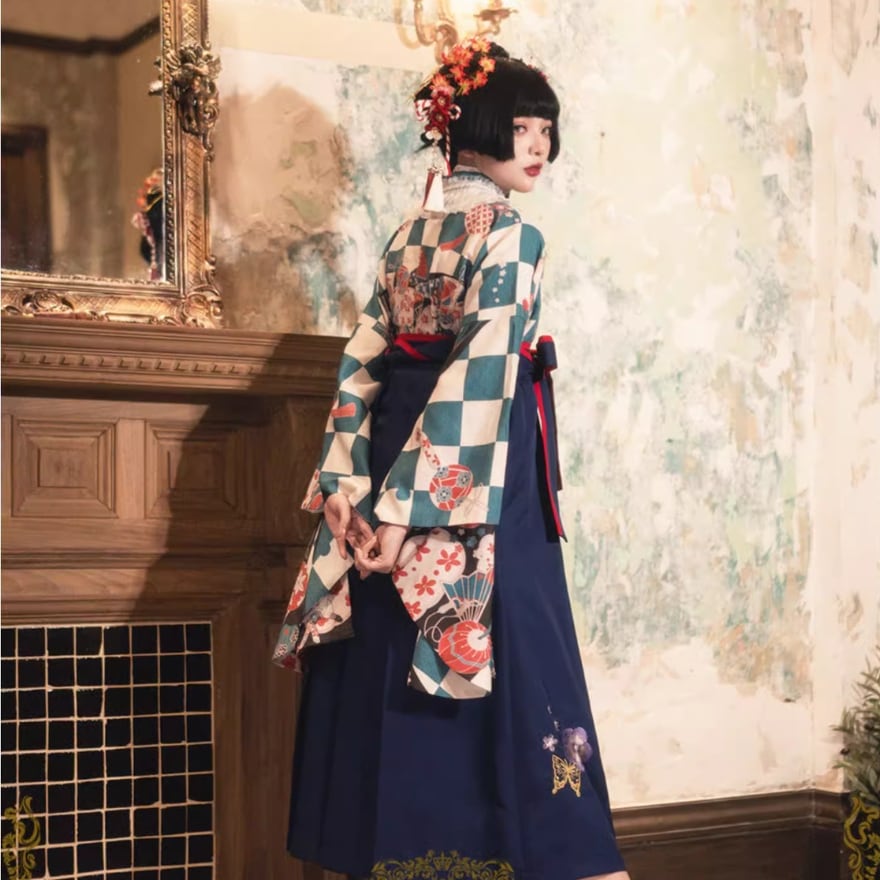 即納 和ロリ 着物 グリーン 市松模様 大正浪漫風 イベント衣装