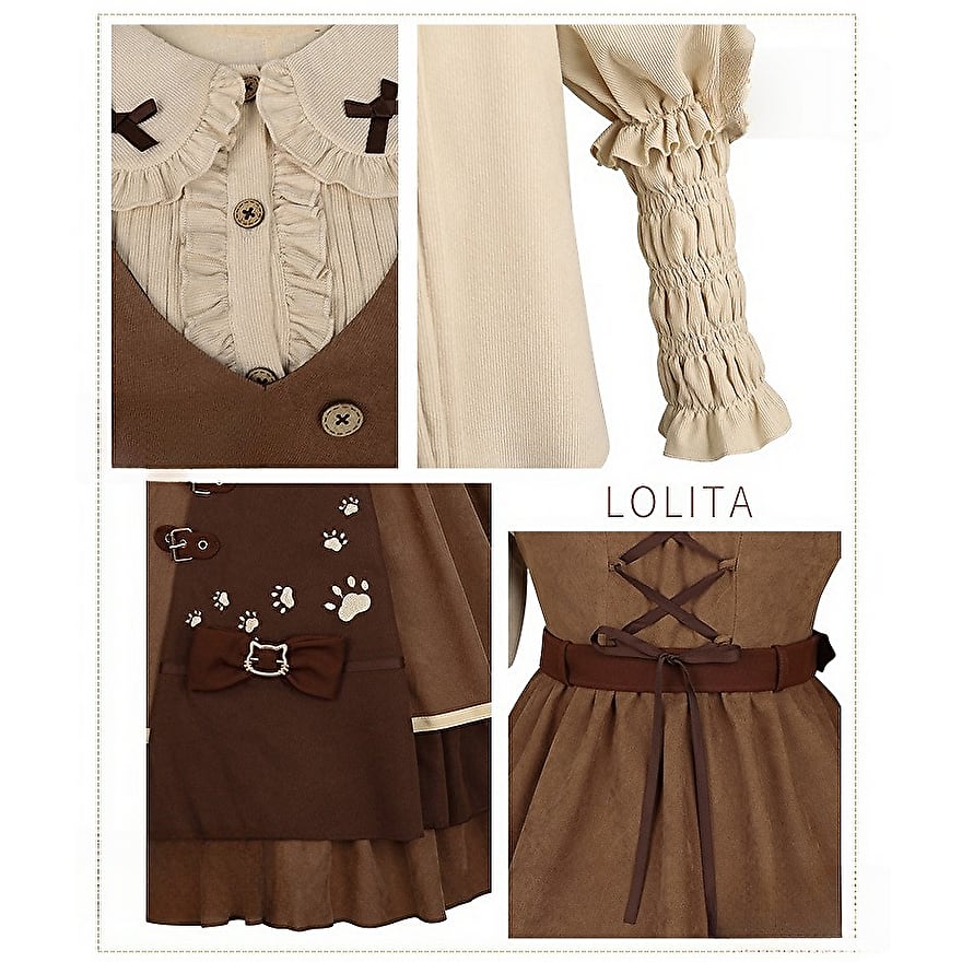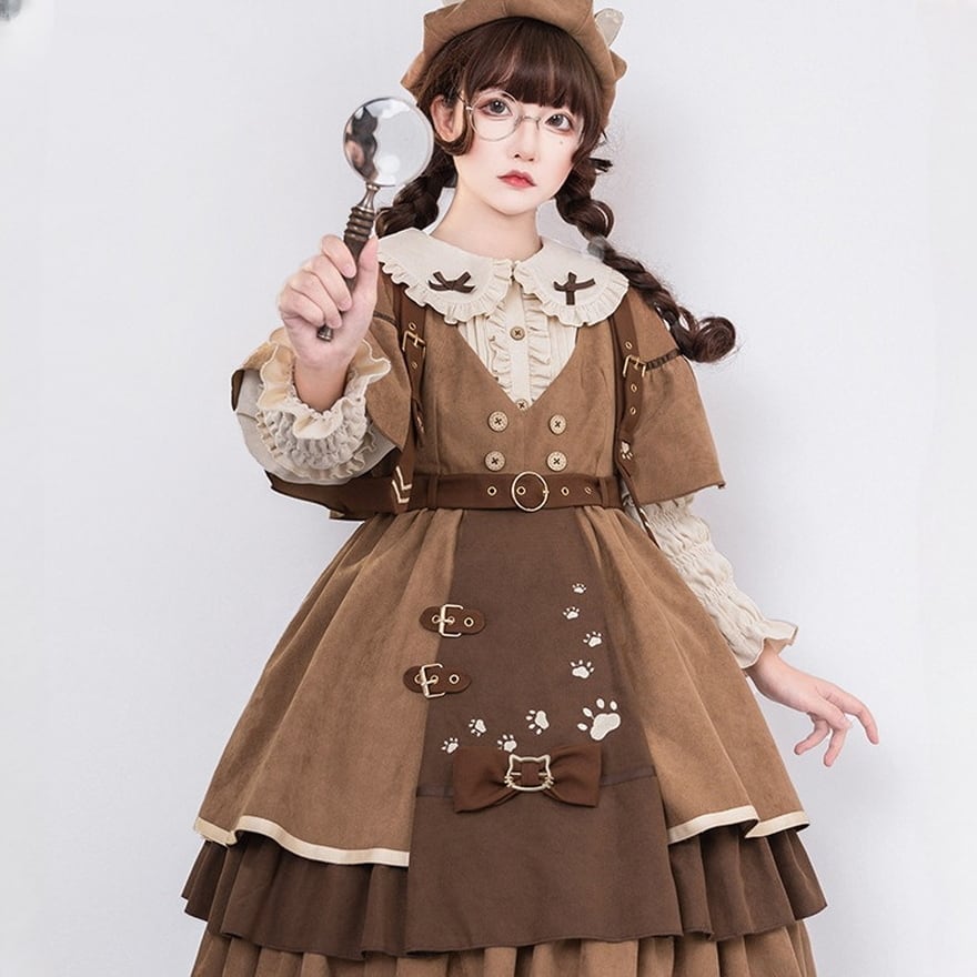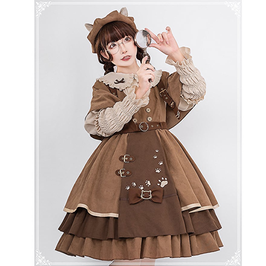 ブラウン系カラーのノスタルジックな印象の猫探偵4点セット割りのオールインワンです。