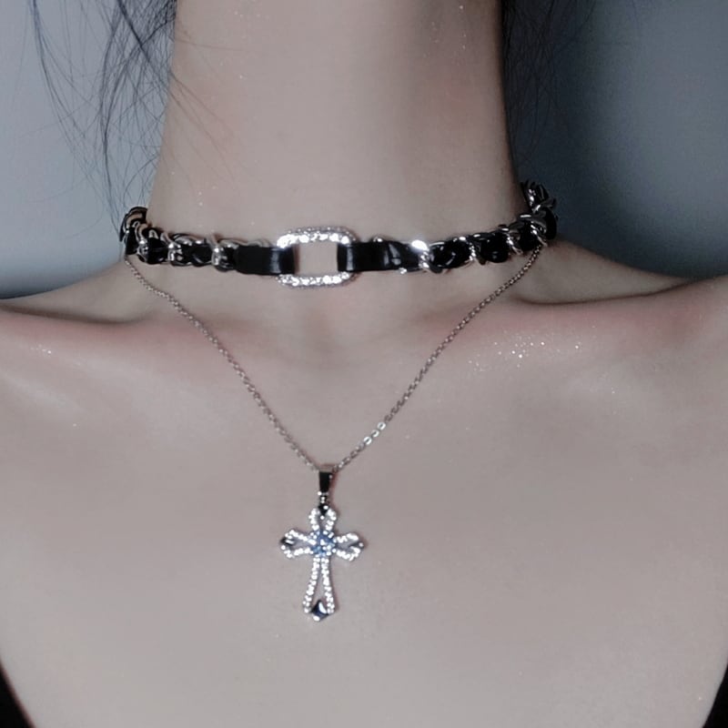 PUレザーのチョーカーに十字架チェーンネックレスの2連アクセサリーになります。