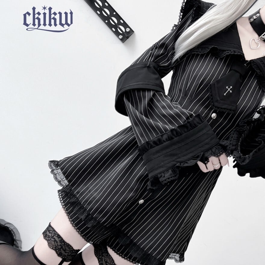 襟元のタイや、袖のラインに施されたクロスの刺繍やモチーフが、ゴシックまたはクラシカルなアクセントになっています。