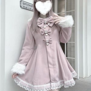 淡いピンクの生地に、オフホワイトのふわふわなファーがあしらわれた、甘ロリータのコートです。