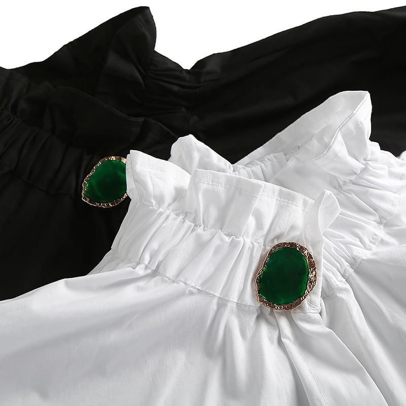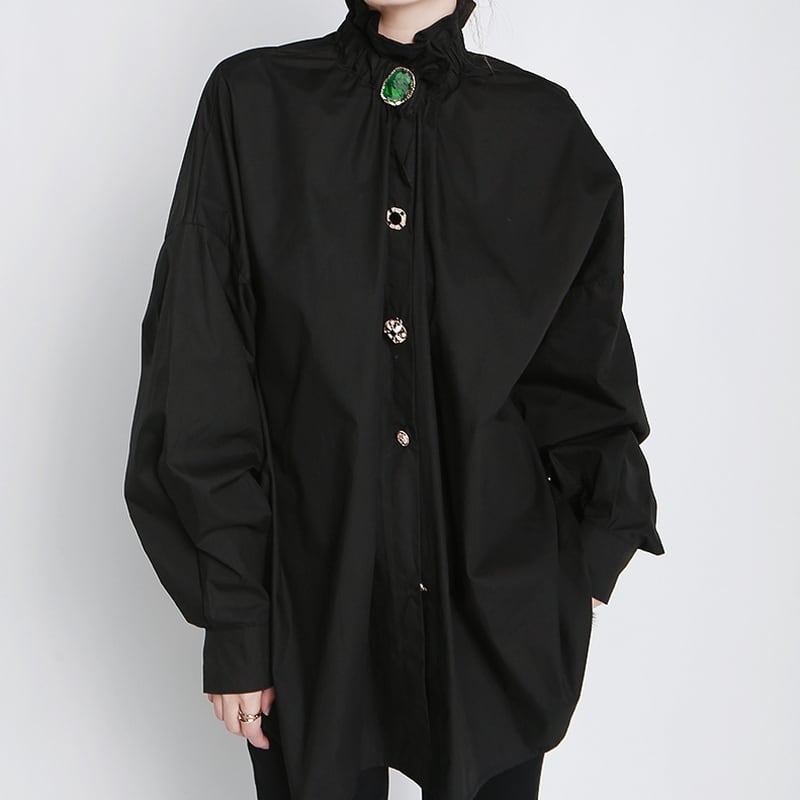 上品なネックギャザーにフィエクエメラルドが存在感抜群なオーバーサイズブラウスです。
