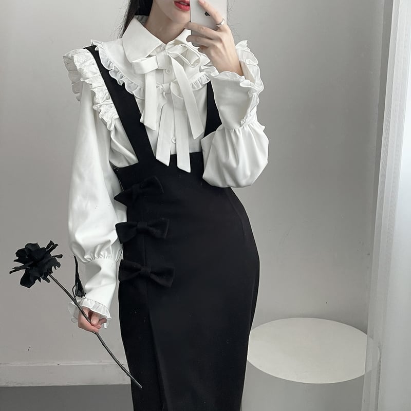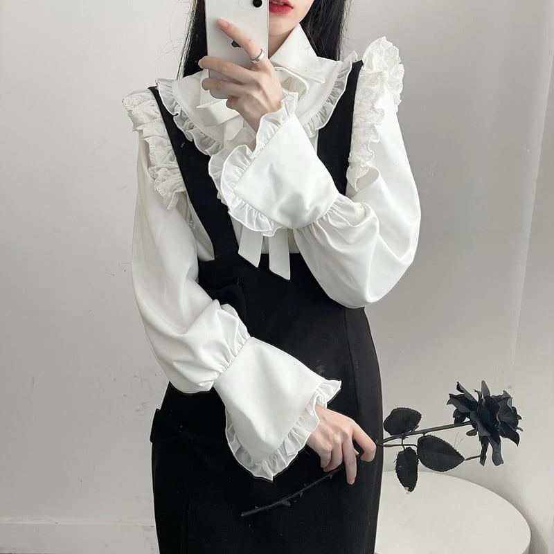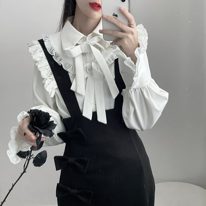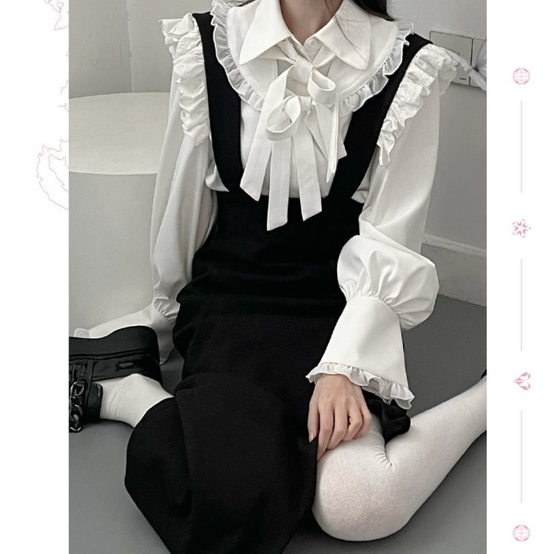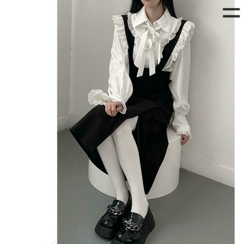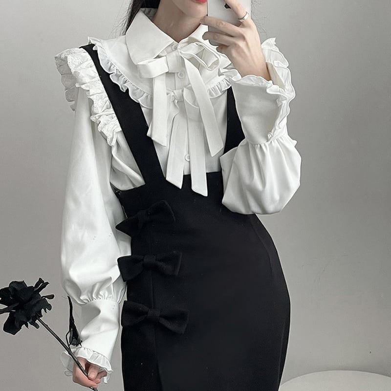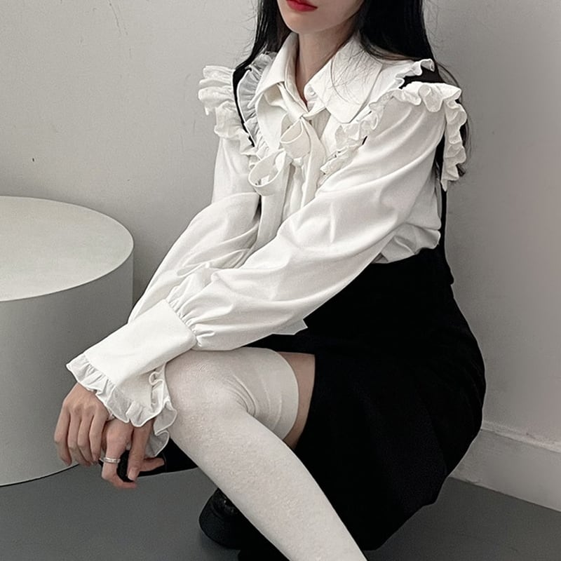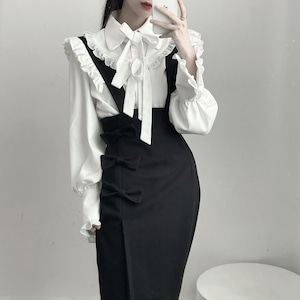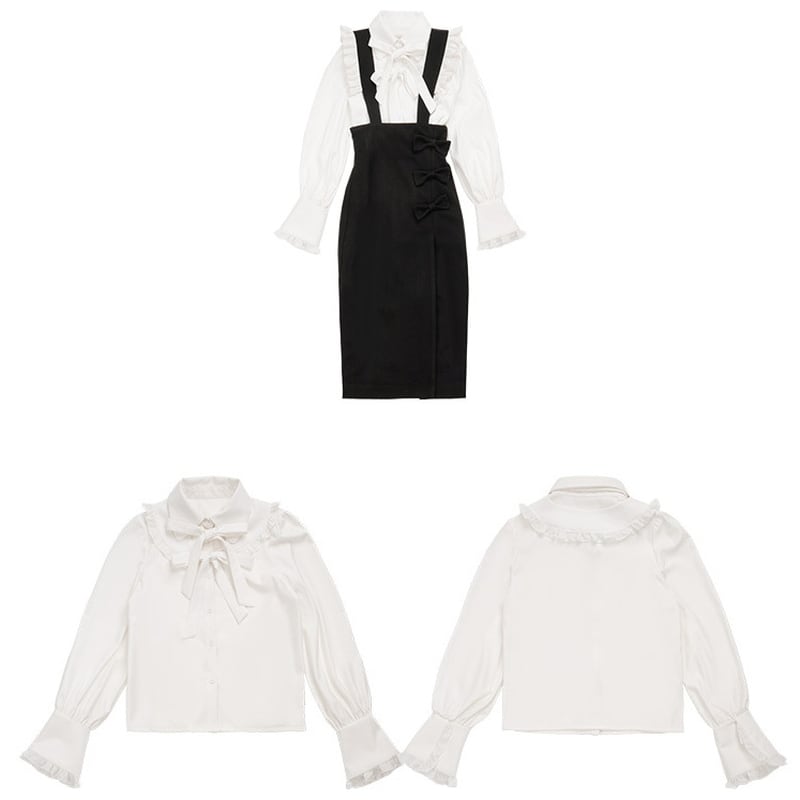 小顔効果とレイヤード:大きなボウタイとフリルが視線を上に集め、小顔効果が期待できます。Vネックのニットやベストの下に着ることで、フリルや襟だけを見せるクラシックなレイヤードも楽しめます。
