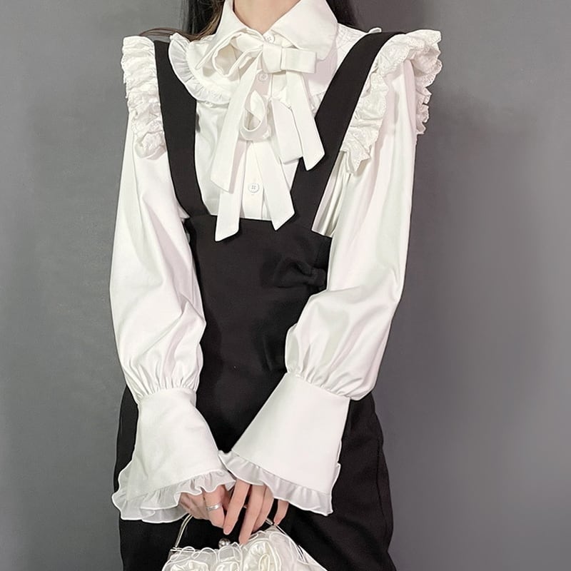 フリルとボウタイ(リボンタイ)が特徴的なブラウス。襟元や肩、袖口にたっぷりと施されたフリルがロマンティックな印象を与えます。袖はややボリュームのあるパフスリーブで、カフス部分も広がりがあり、クラシカルな要素をプラスしています。