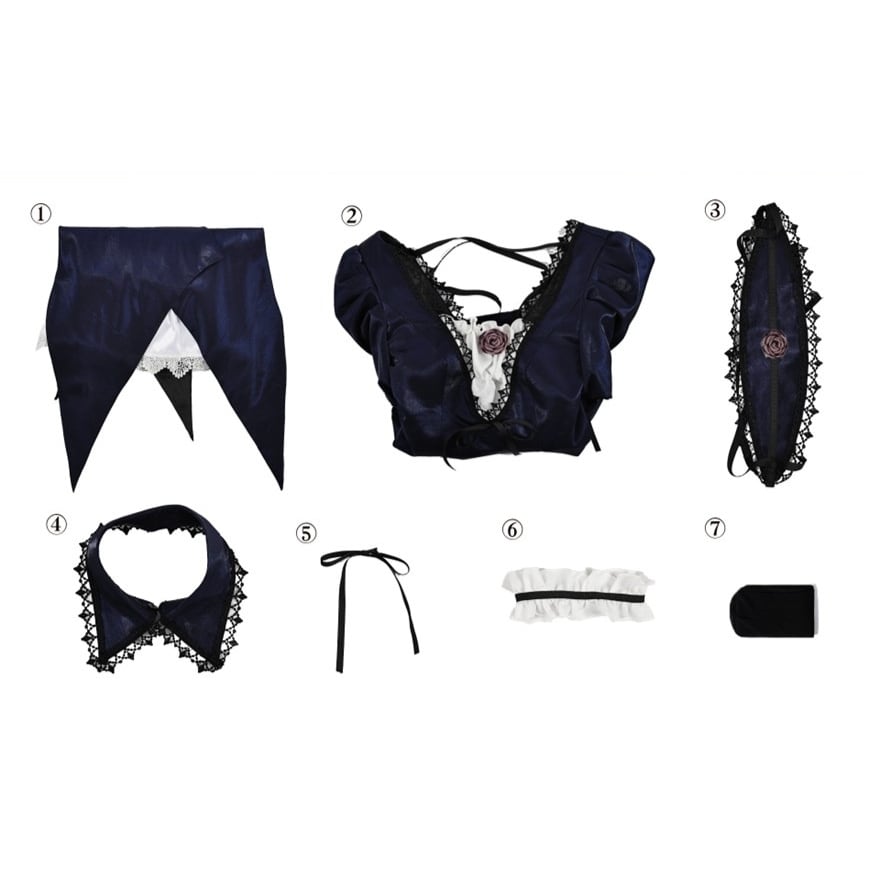 セットアップには、スカート、トップス、ヘアアクセサリー、ネックオーナメント、蝶ネクタイ、レッグレット、ソックスが含まれており、完成度の高いコーディネートが楽しめます。