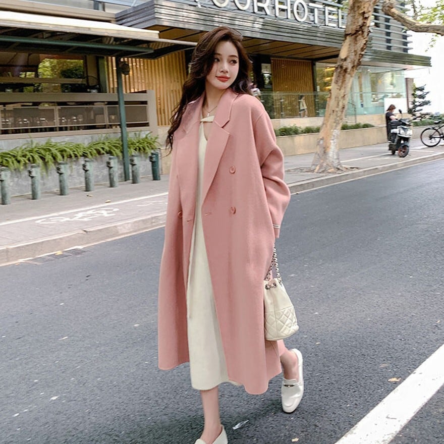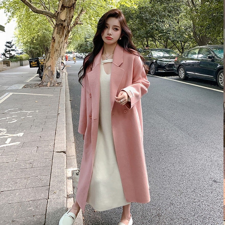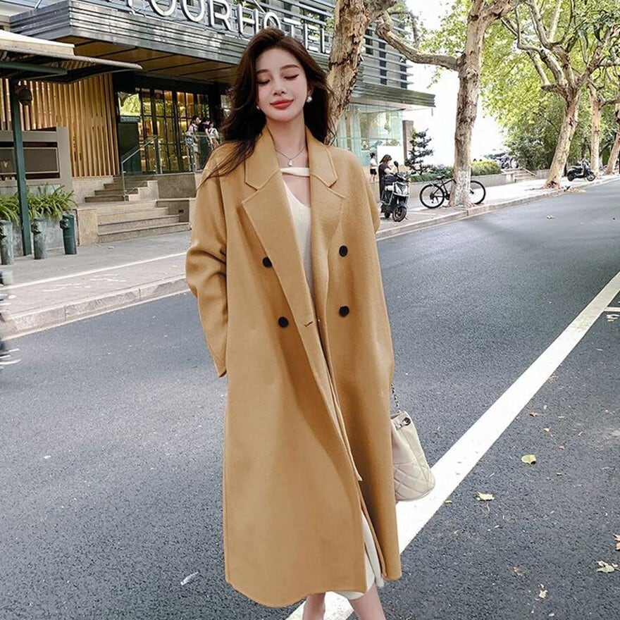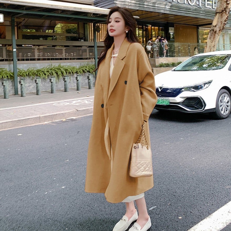 上質な素材感が魅力のダブルブレストロングコートです。トレンドに左右されないクラシカルなデザインと、ゆったりとしたシルエットが、大人のエレガントさを引き立てます。