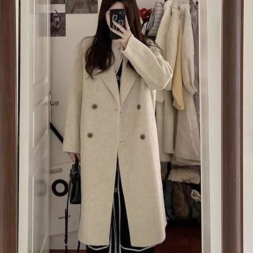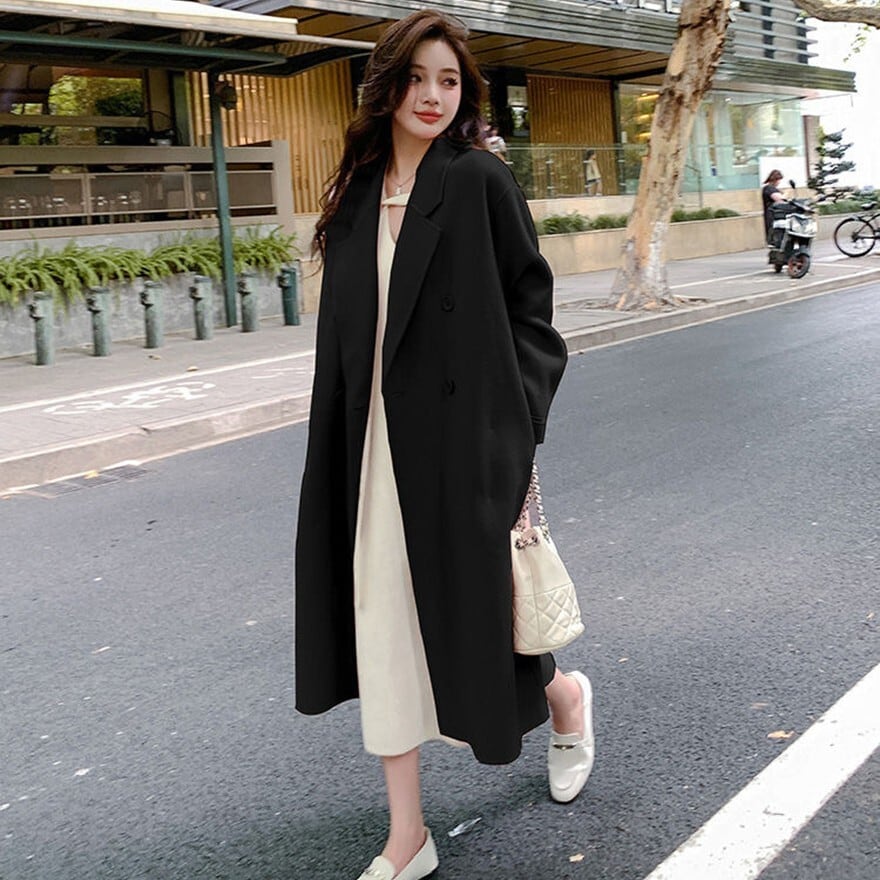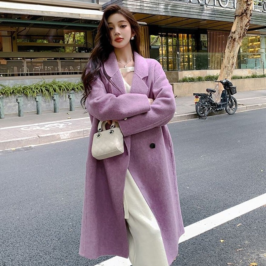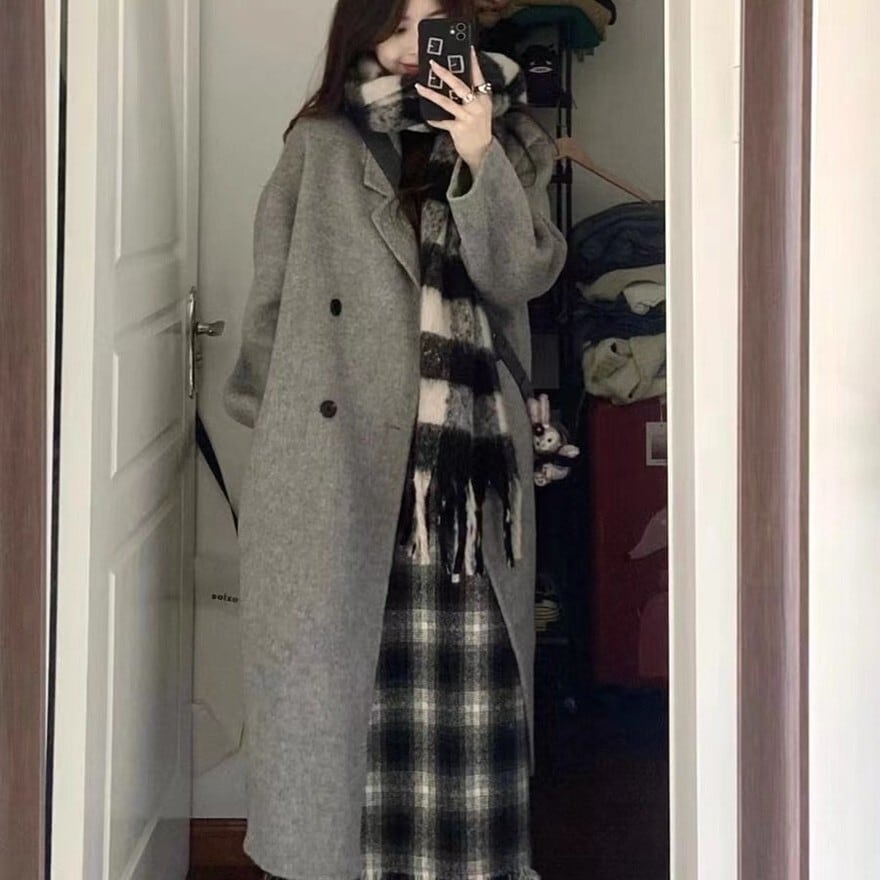 上質な素材感が魅力のダブルブレストロングコートです。トレンドに左右されないクラシカルなデザインと、ゆったりとしたシルエットが、大人のエレガントさを引き立てます。