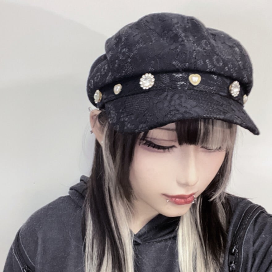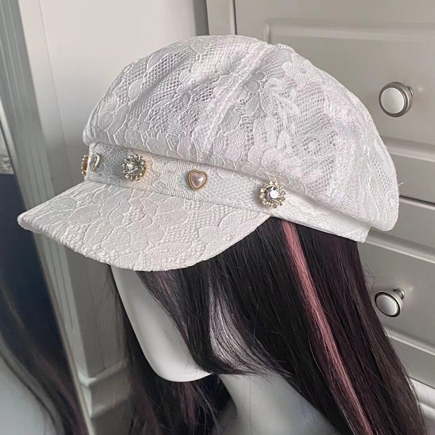 本体に繊細なレース生地を使用したキャスケットです。つばの付け根部分には、パールやラインストーンをあしらったハートモチーフなどの装飾が並べられています。