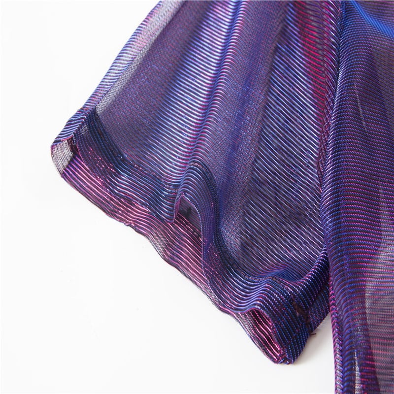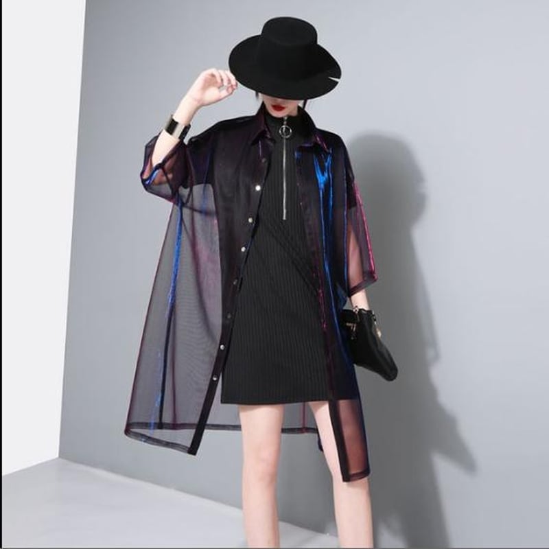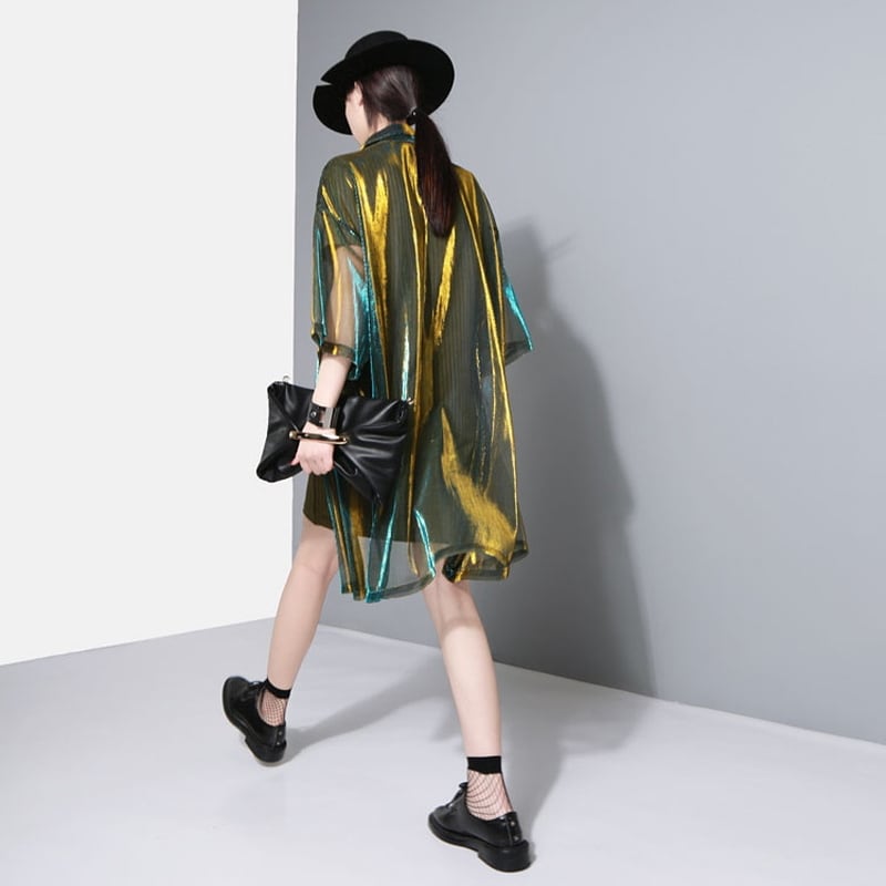 シースルーのシフォン生地にレインボーカラーを織り交ぜた生地なので、見る角度によって様々な表情を見せてくれるビジュアル抜群なロングシャツです。ロング丈だからTシャツにさらっと羽織って大人きれいめなシルエットにコーデを格上げしてくれます。