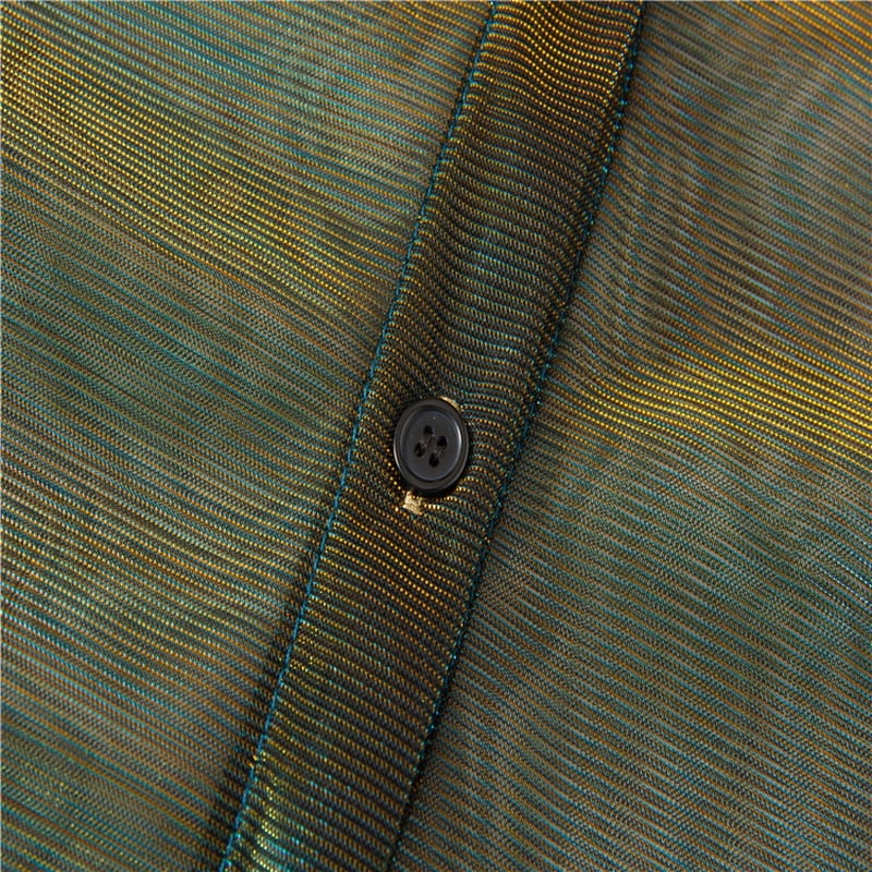 見る角度によって独特の表情が個性的な玉虫カラーのロングシャツです。