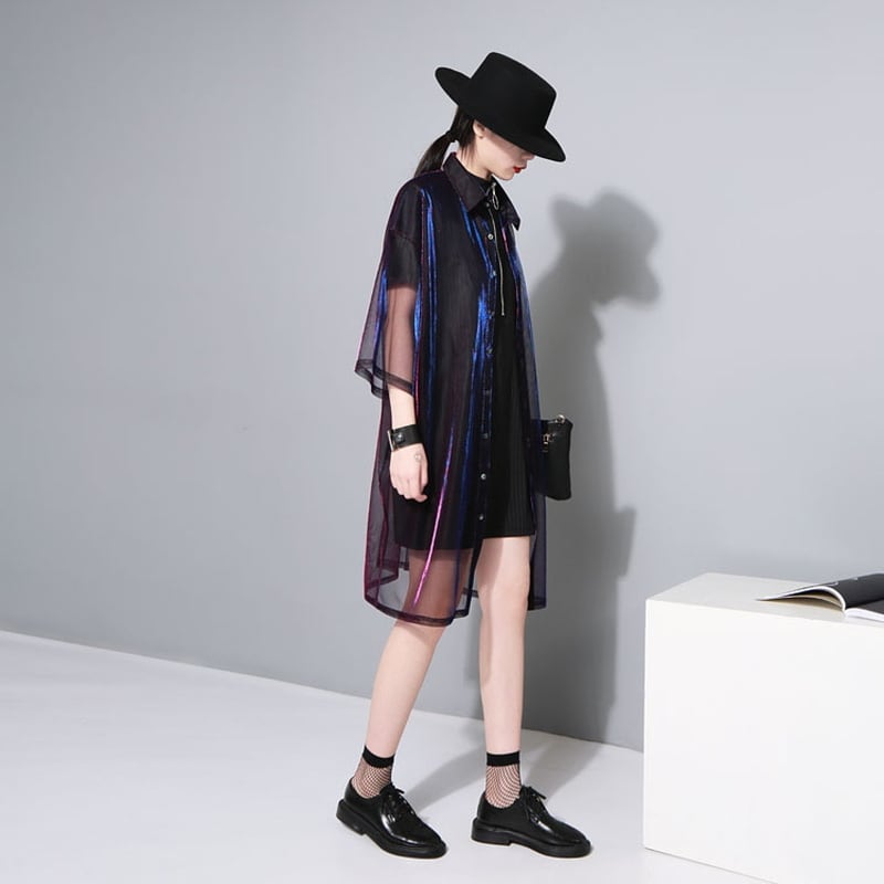 モード系 シャツ カーディガン レース シフォン 透け感 玉虫カラー