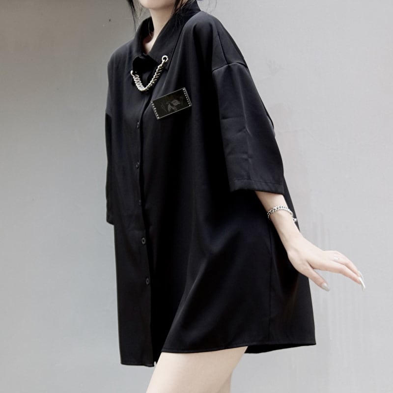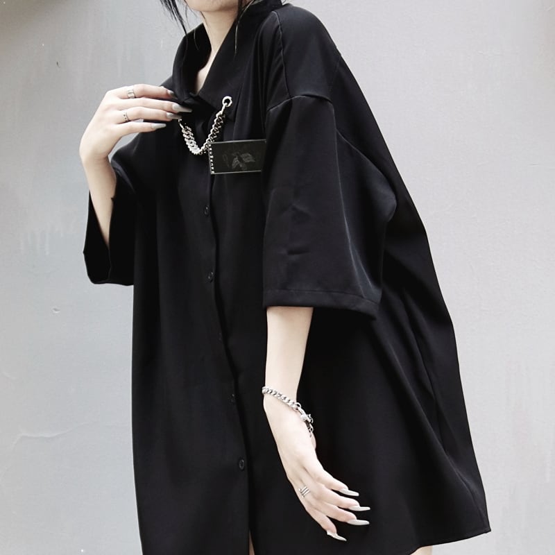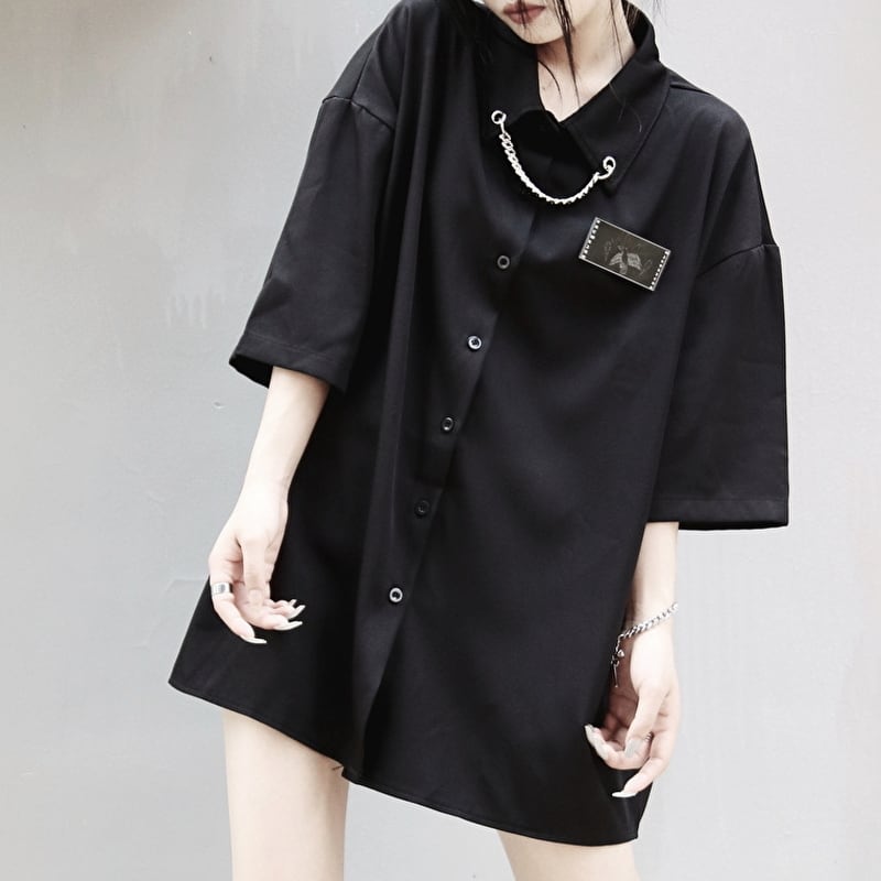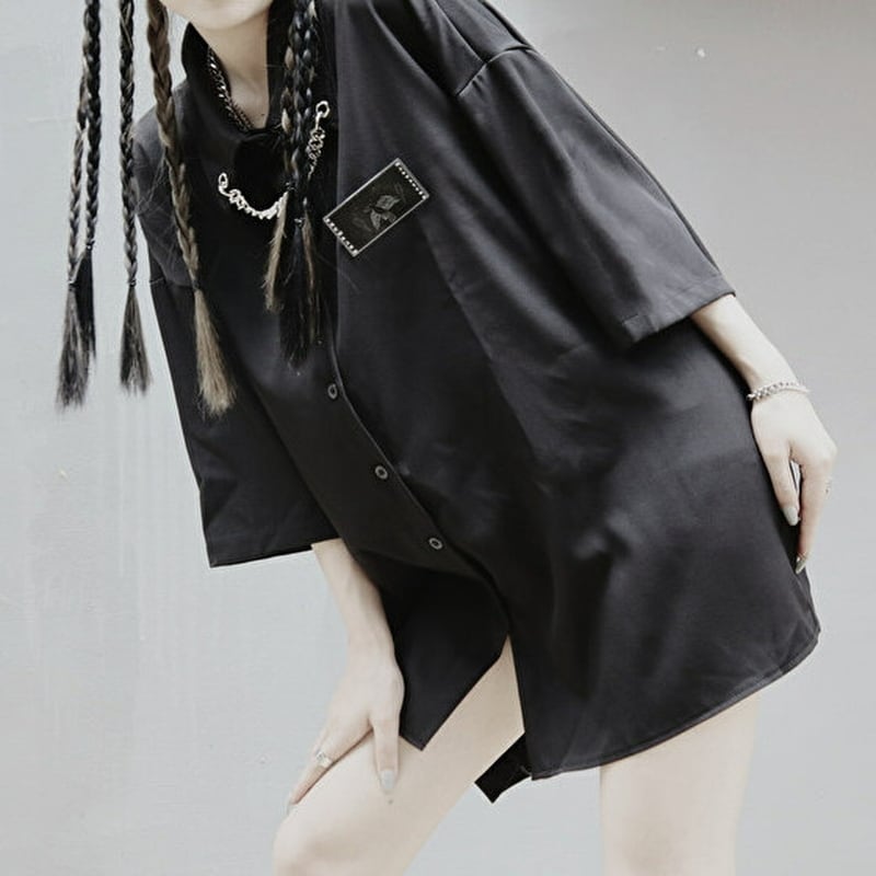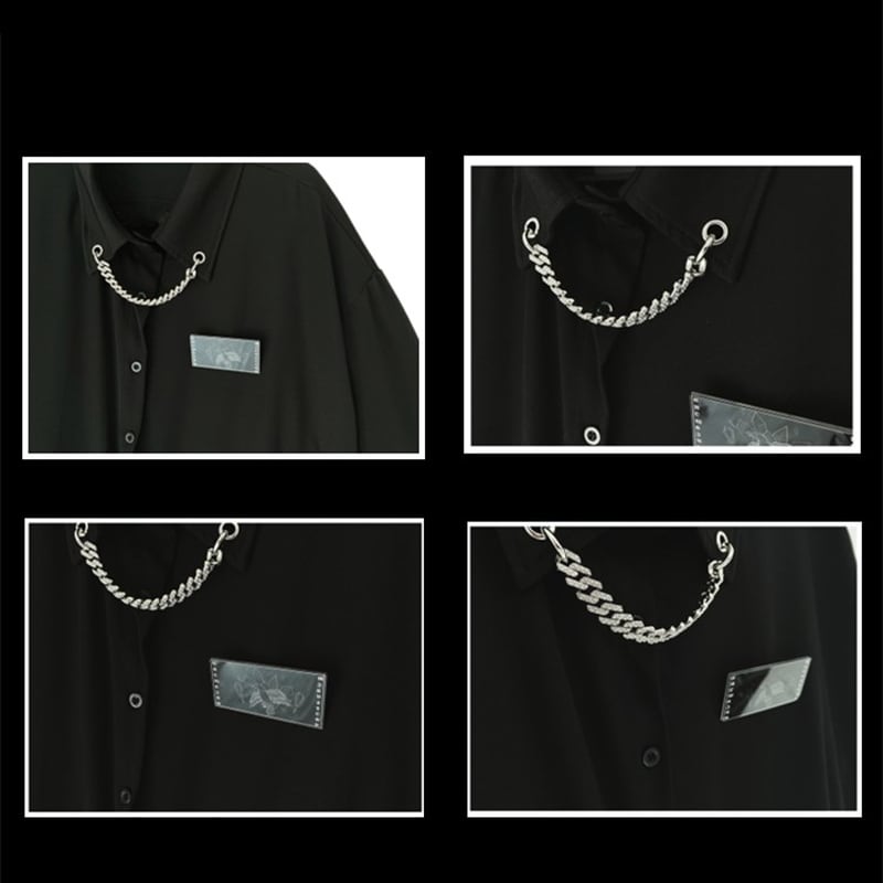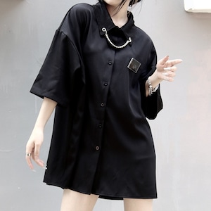 ゆったりしたサイズ感に7分袖丈、ネックカラーのチェーンが病みかわいさを演出してくれる黒シャツです。