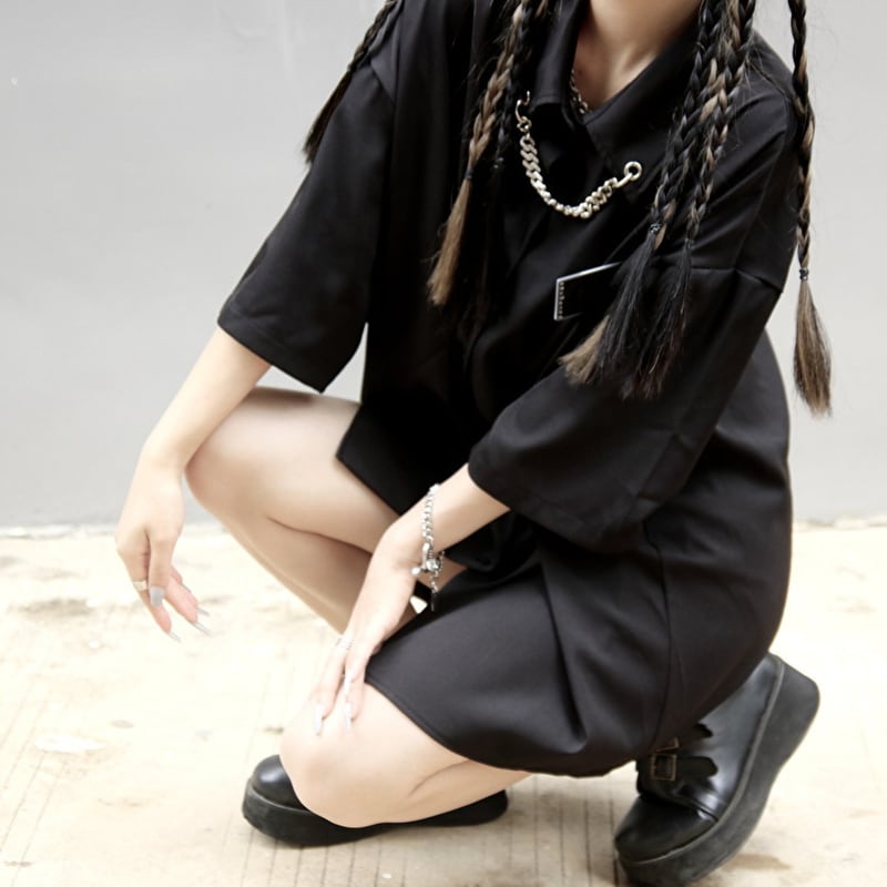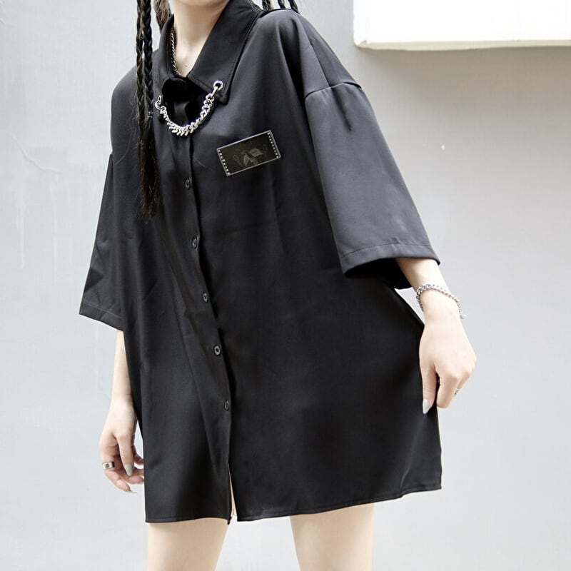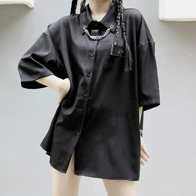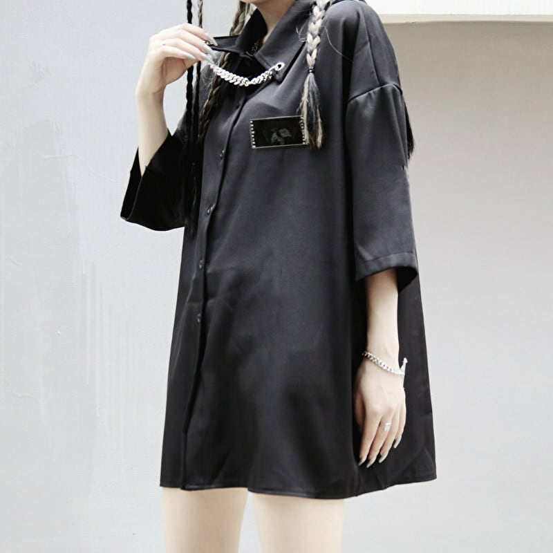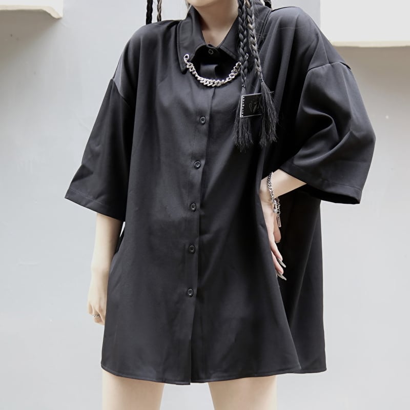 ゆったりしたサイズ感に7分袖丈、ネックカラーのチェーンが病みかわいさを演出してくれる黒シャツです。