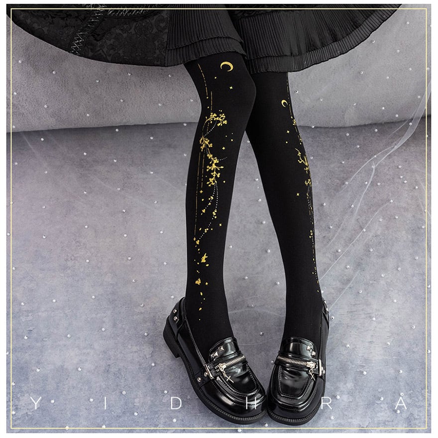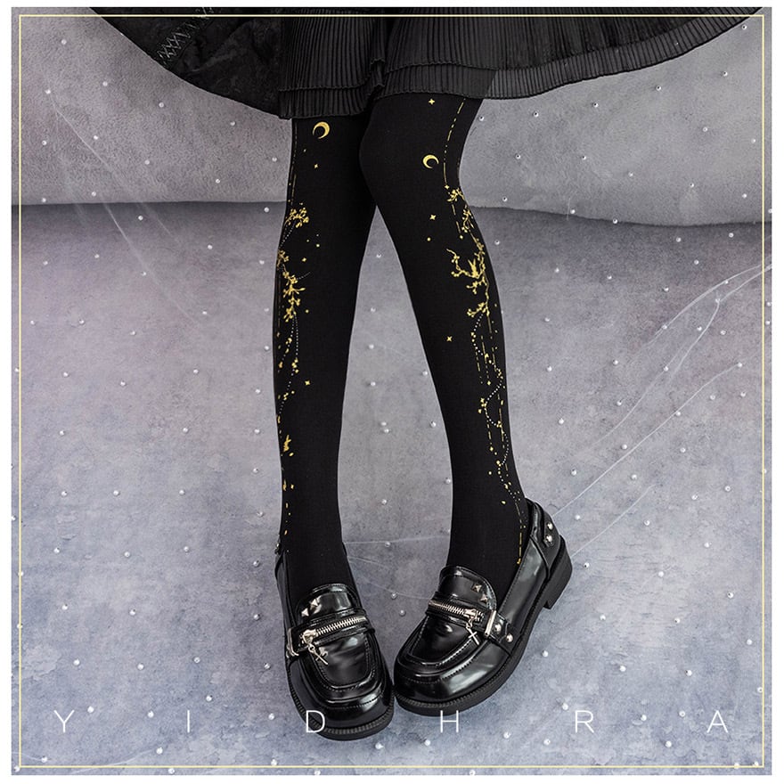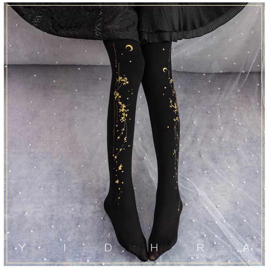 【星月夜の夢】パンスト ストッキング タイツ ゴールドプリント・アシンメトリータイツ - コスモ・ファンタジア