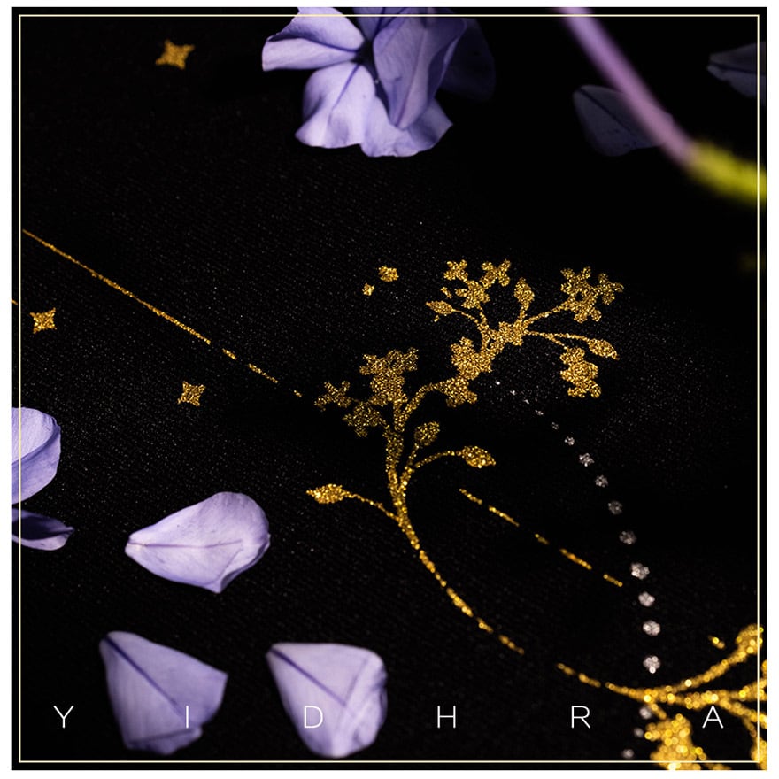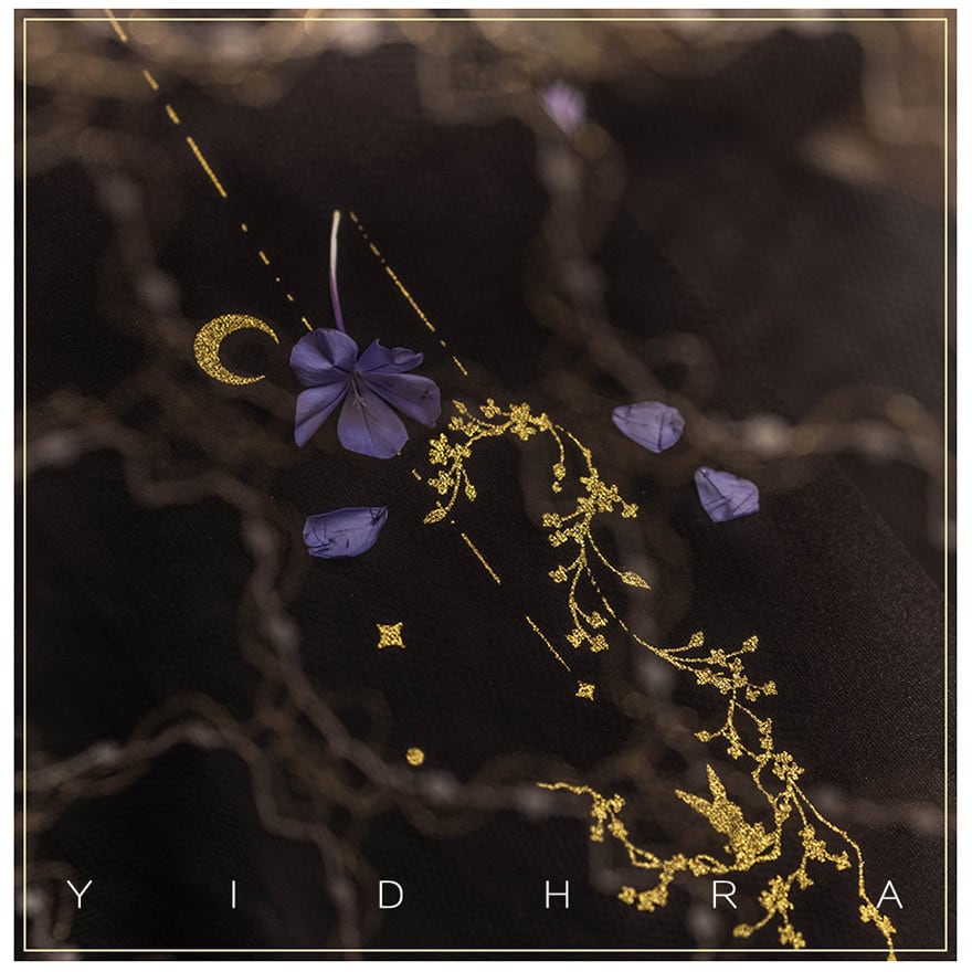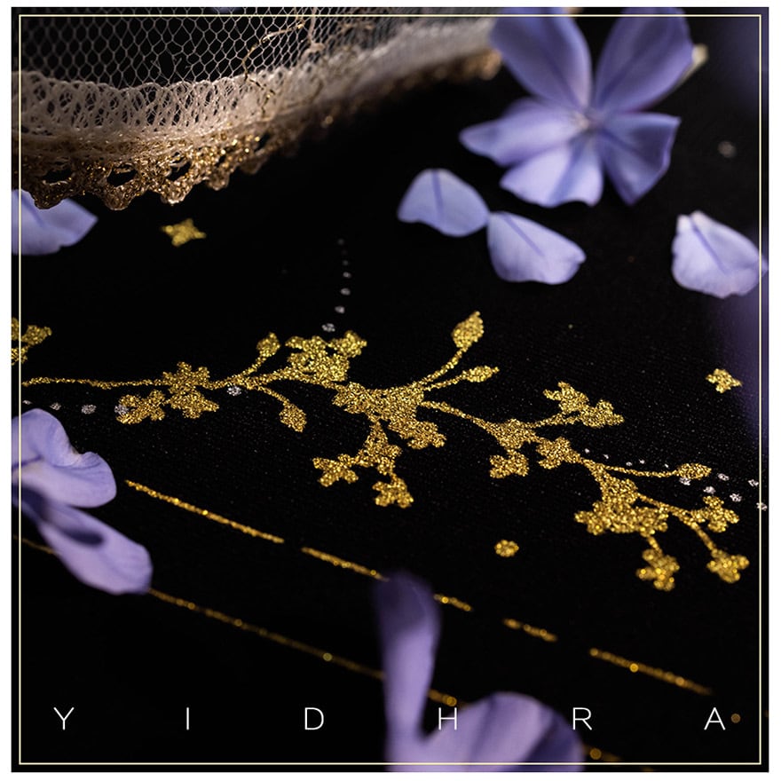 深い夜を思わせるマットなブラックの生地に、贅沢なゴールドのメタリックプリントを施しました。まるで星の屑がこぼれ落ちたような繊細なグラフィックが、歩くたびに優雅に輝き、見る人の視線を釘付けにします。