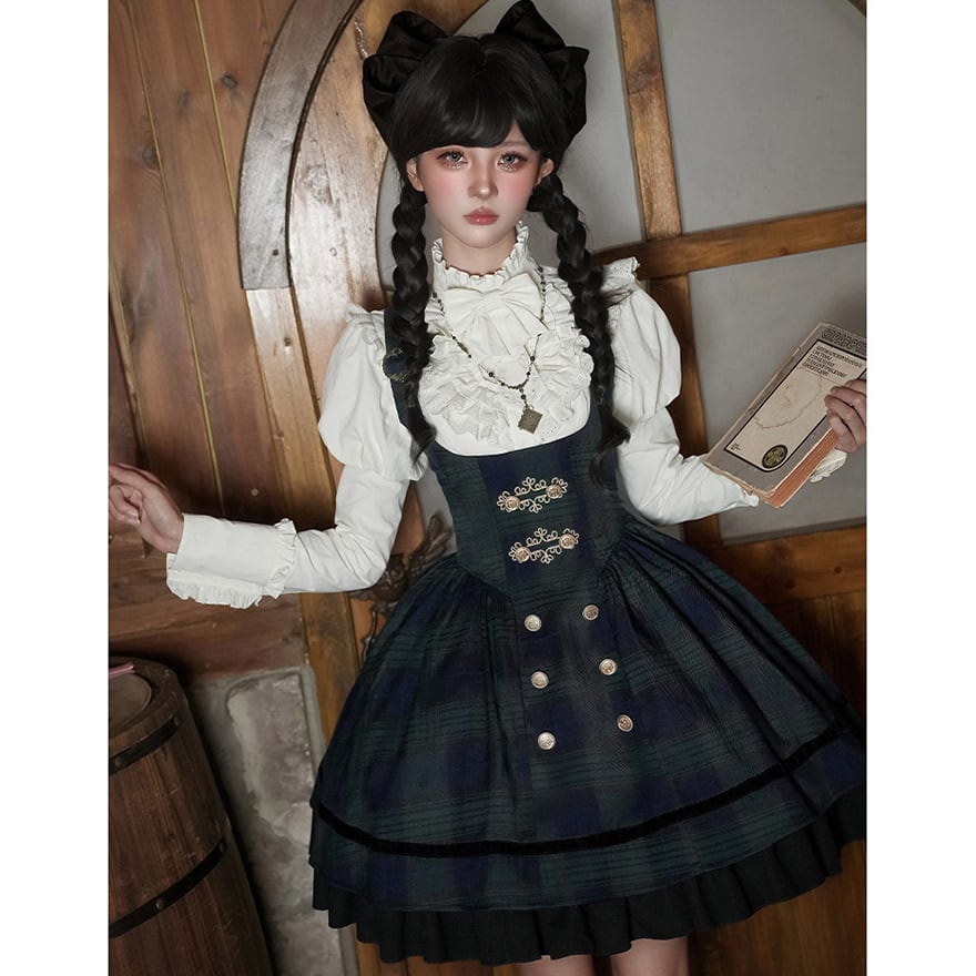 深い緑と紺のタータンチェックが、英国の魔法学校の制服を思わせる、キュートなジャンパースカートセットです。