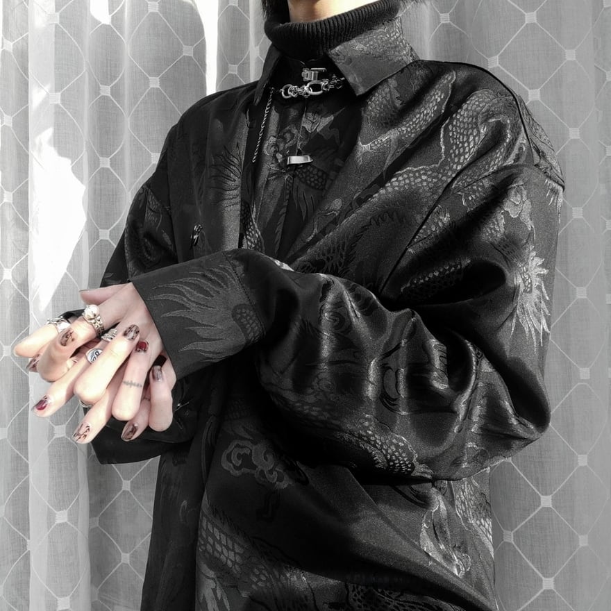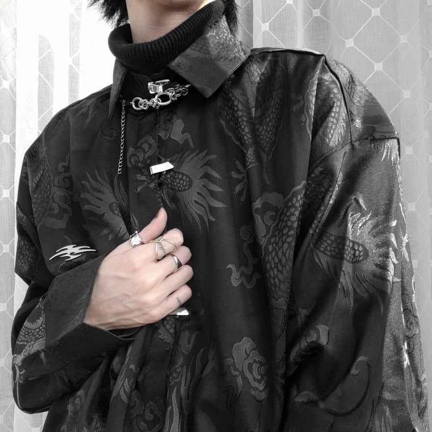 高見えするシルキーな生地にドラゴン柄がおしゃれなチャイナ風長袖シャツです。