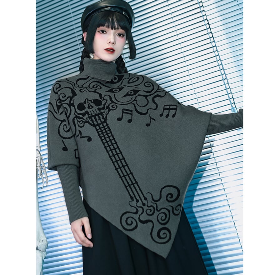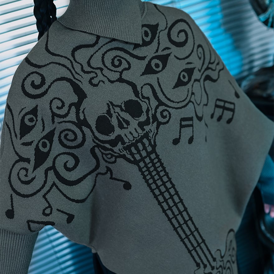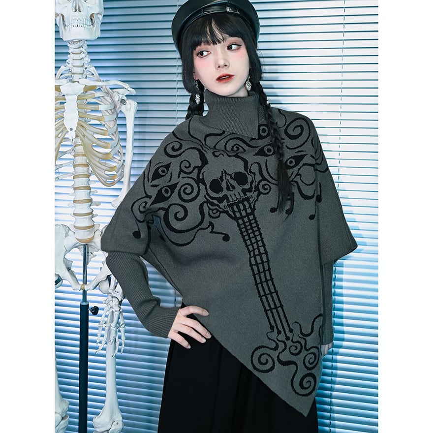 チャコールグレーの生地に、黒で描かれたスカルと呪術的な紋様が目を引くハイネックセーターです。