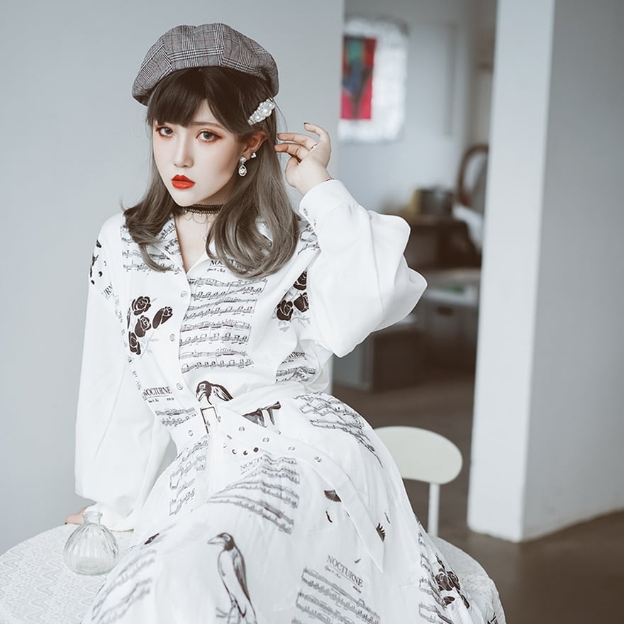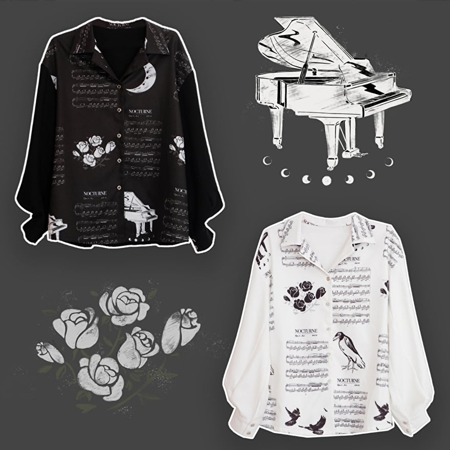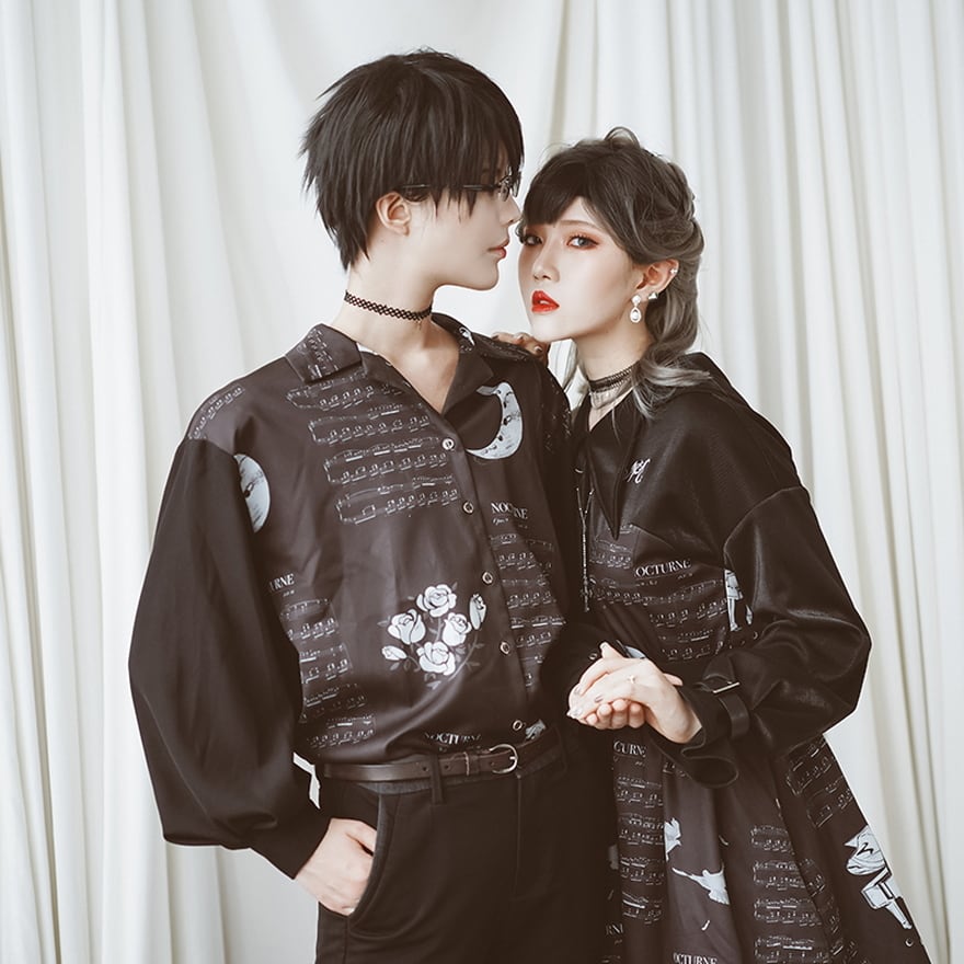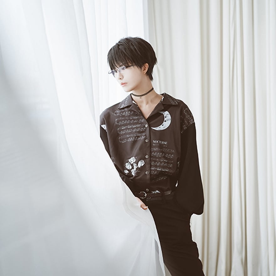 ゴスロリ 長袖シャツ ランタンスリーブ ノクターン 音符プリント 男装コーデ