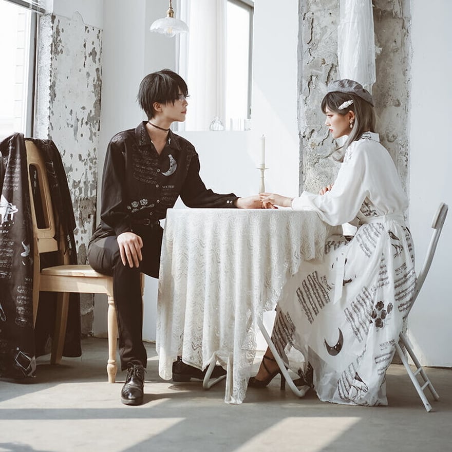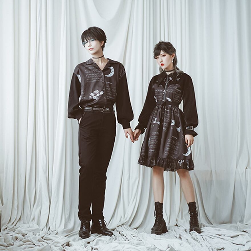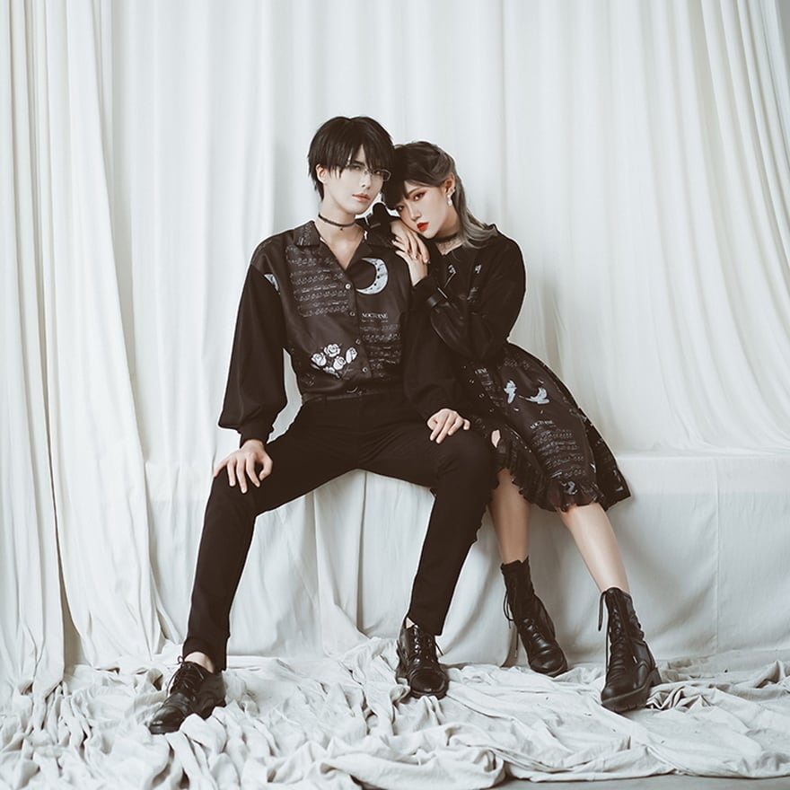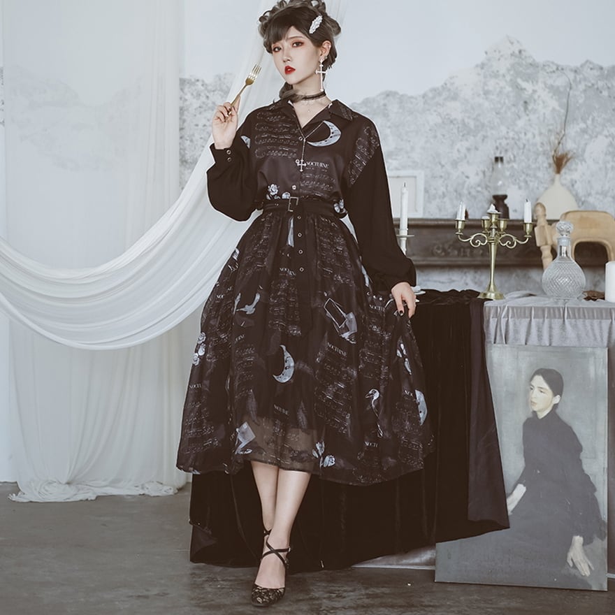 ゴスロリ 長袖シャツ ランタンスリーブ ノクターン 音符プリント 男装コーデ