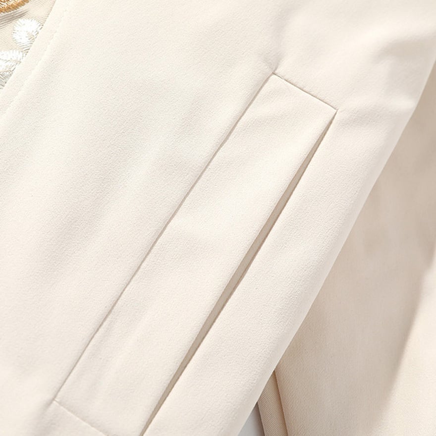 フロントから袖、そして背中のヨーク部分にかけて、まるで絵画のように緻密で美しい中華刺繍が咲き誇ります。