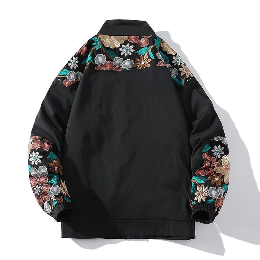 カジュアルなスタンドカラージャケットに、色鮮やかな花々の刺繍を贅沢に施した一着です。