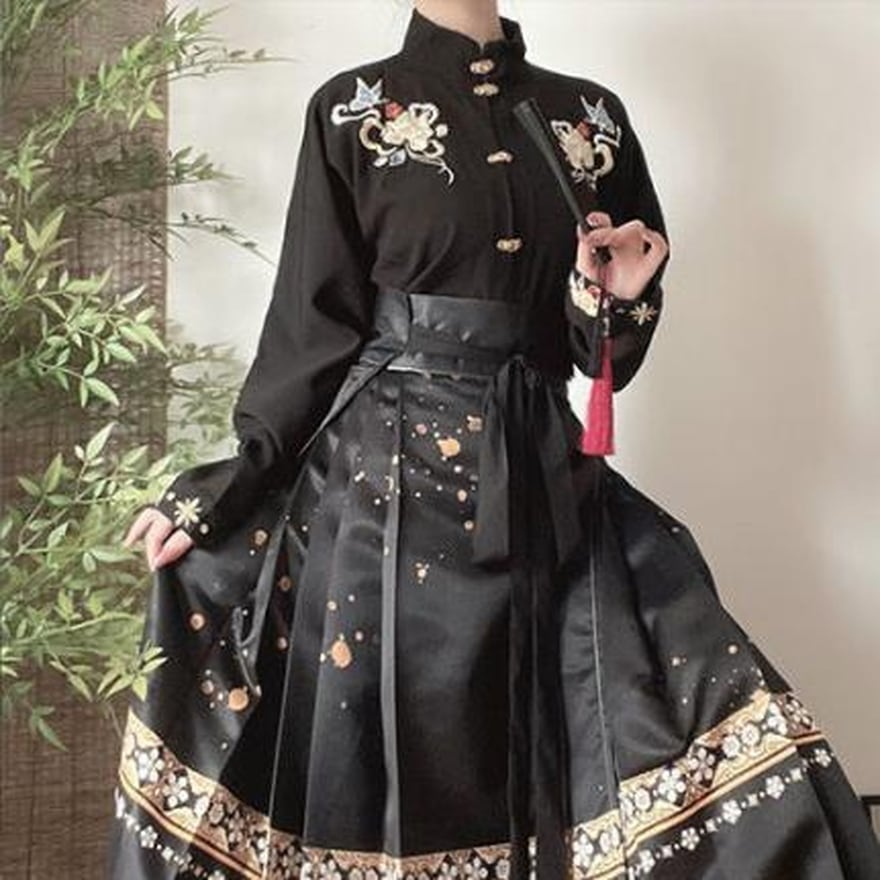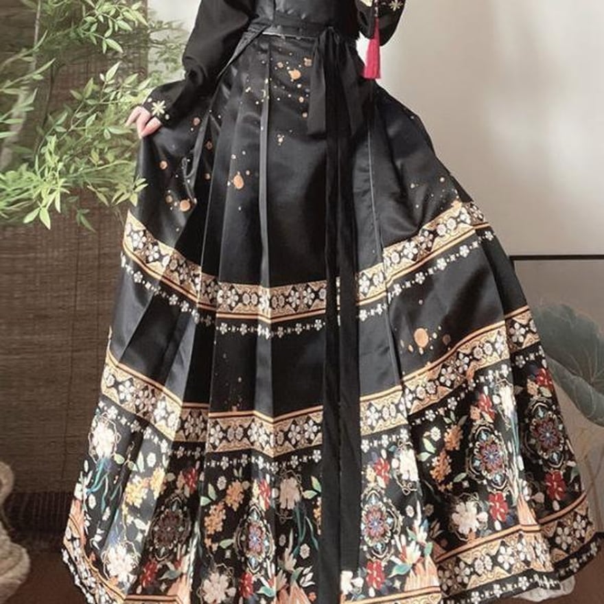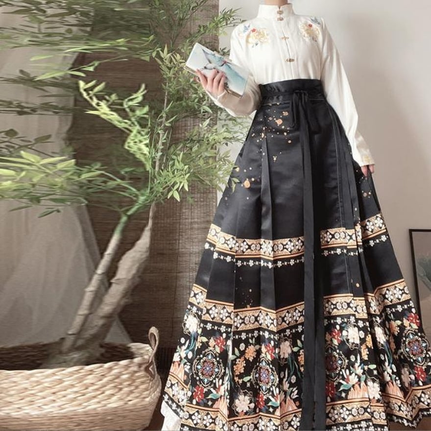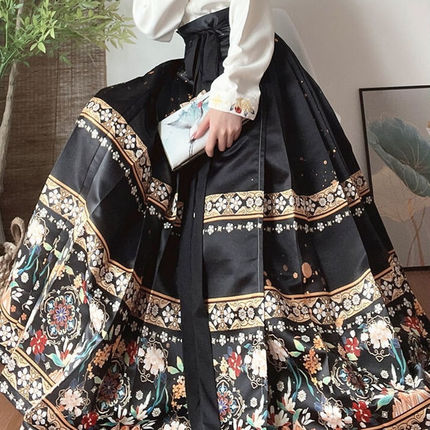 チャイナ服スカートの特徴的なハイウエストロング丈に華やかな花柄プリントがおしゃれ