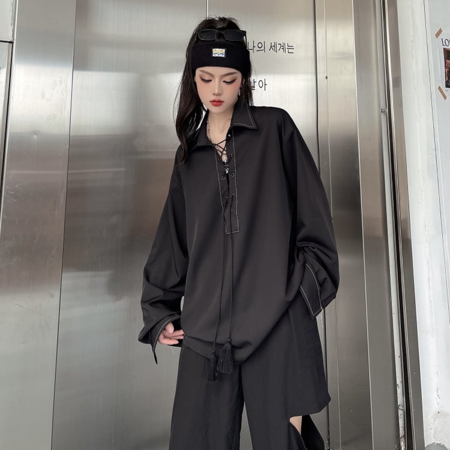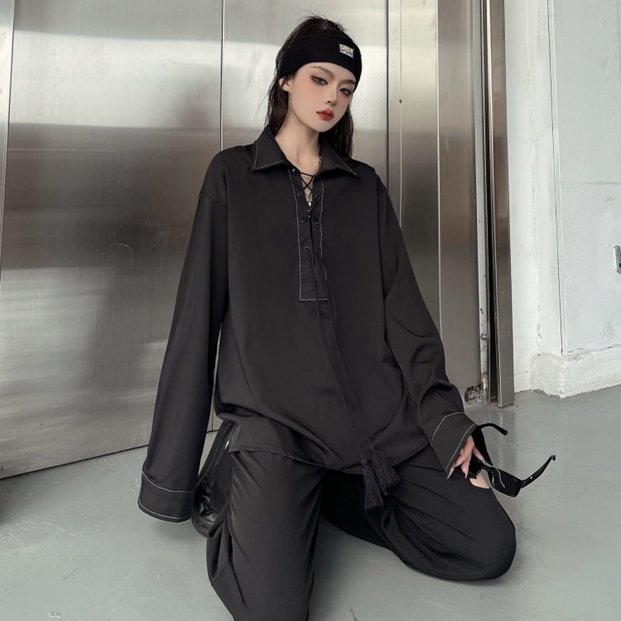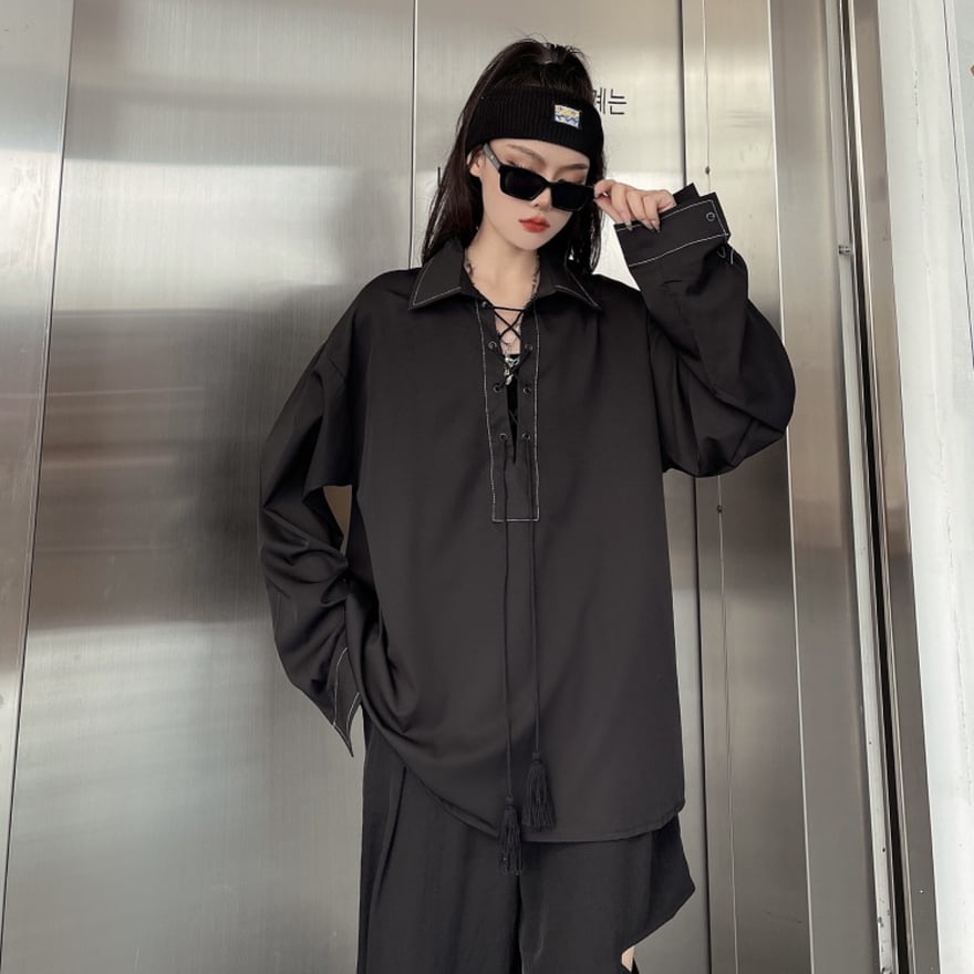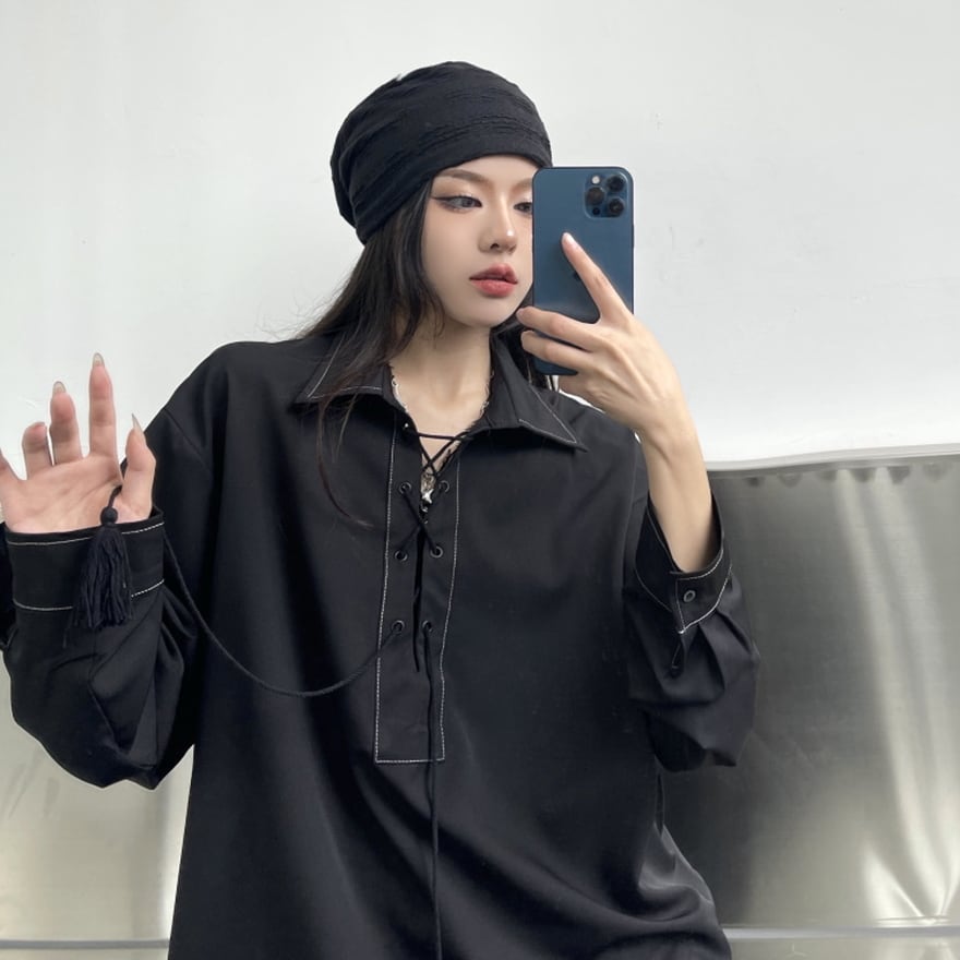 ネックのステッチラインとレースアップが病み可愛いストリート系長袖シャツです