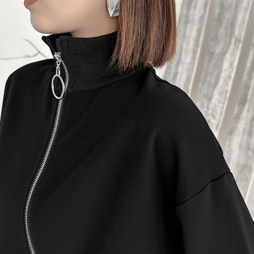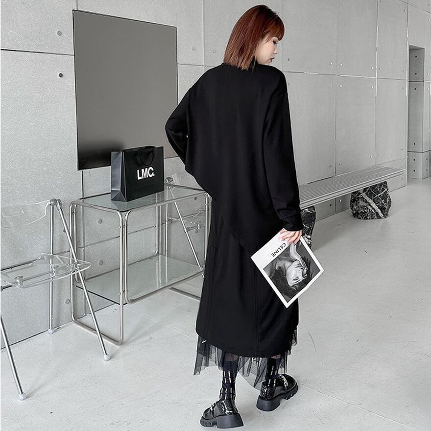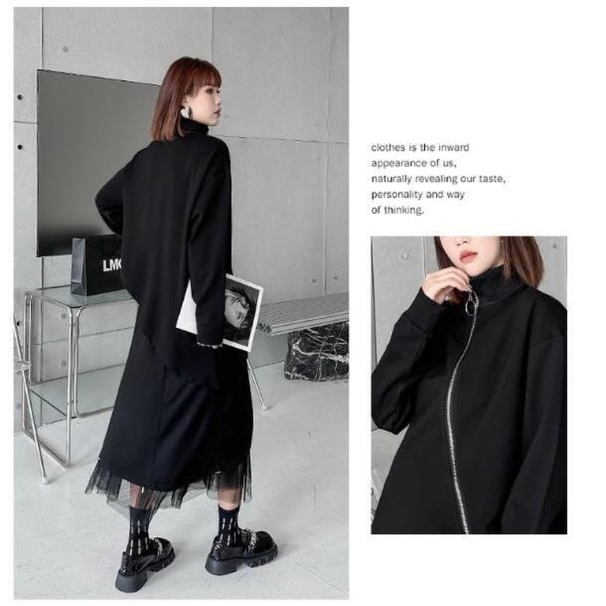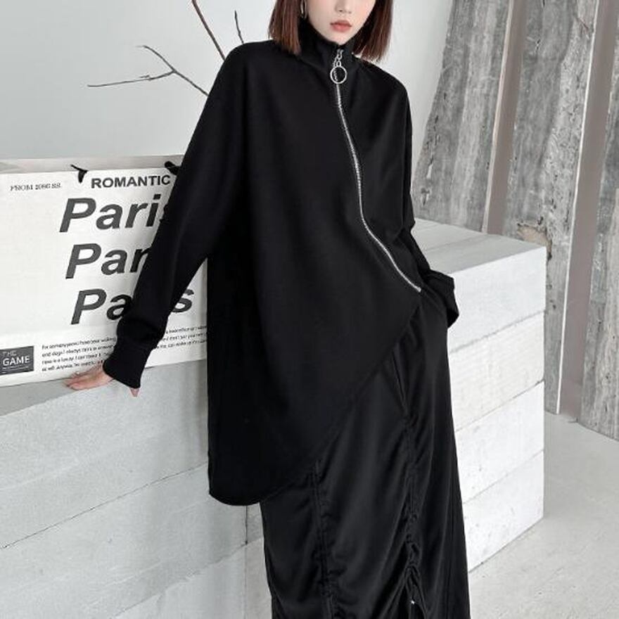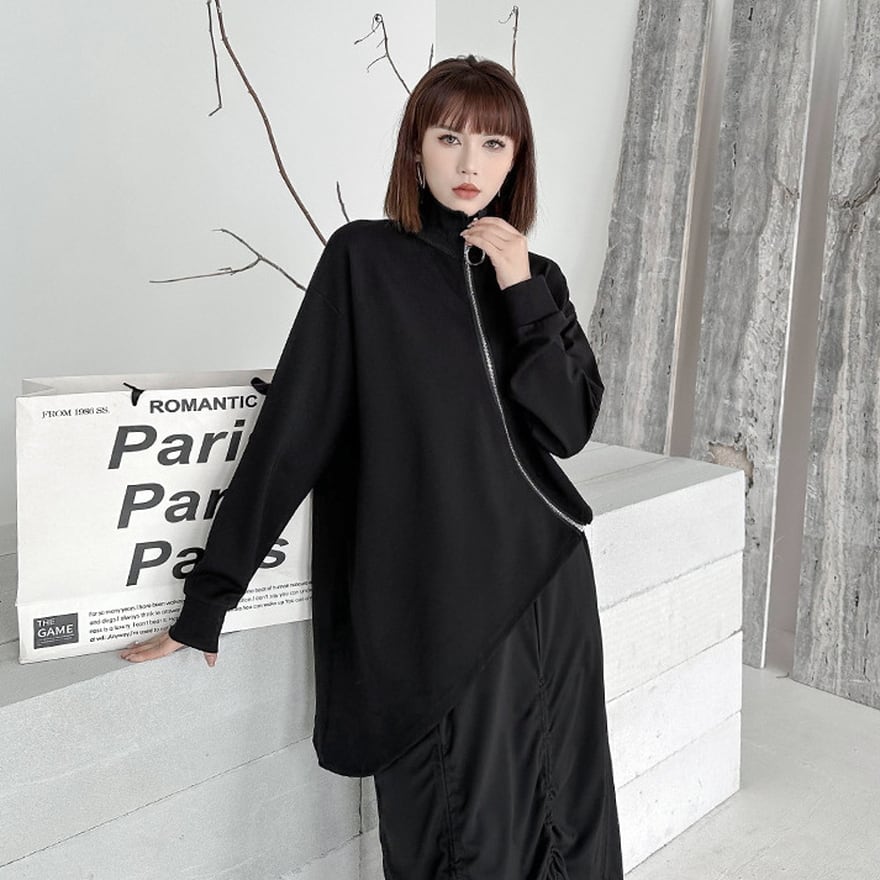 大人の女性にこそ着て欲しい、洗練されたダークモードなロングトップスです。ゆったりとしたドルマンスリーブと、裾のアシンメトリーなカッティングが、着るだけで立体的なドレープを生み出します。最大の特徴は、首元から斜めに施されたシルバーのジッパーと、チェーン付きの引手。このデザインが、シンプルながらもエッジの効いたアクセントになり、モードな強さを引き出します。
