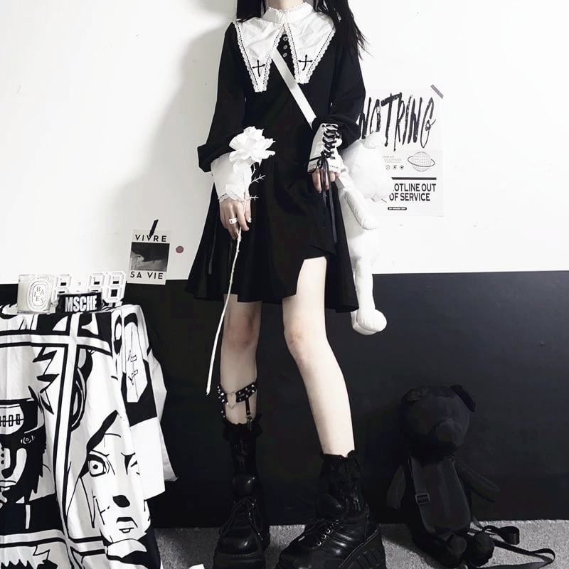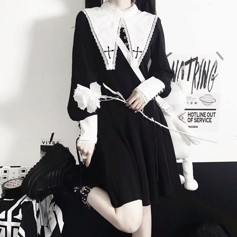 【闇堕ちシスター】ビッグカラー&クロス刺繍 長袖Aラインワンピース
