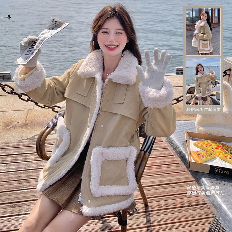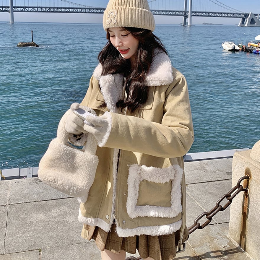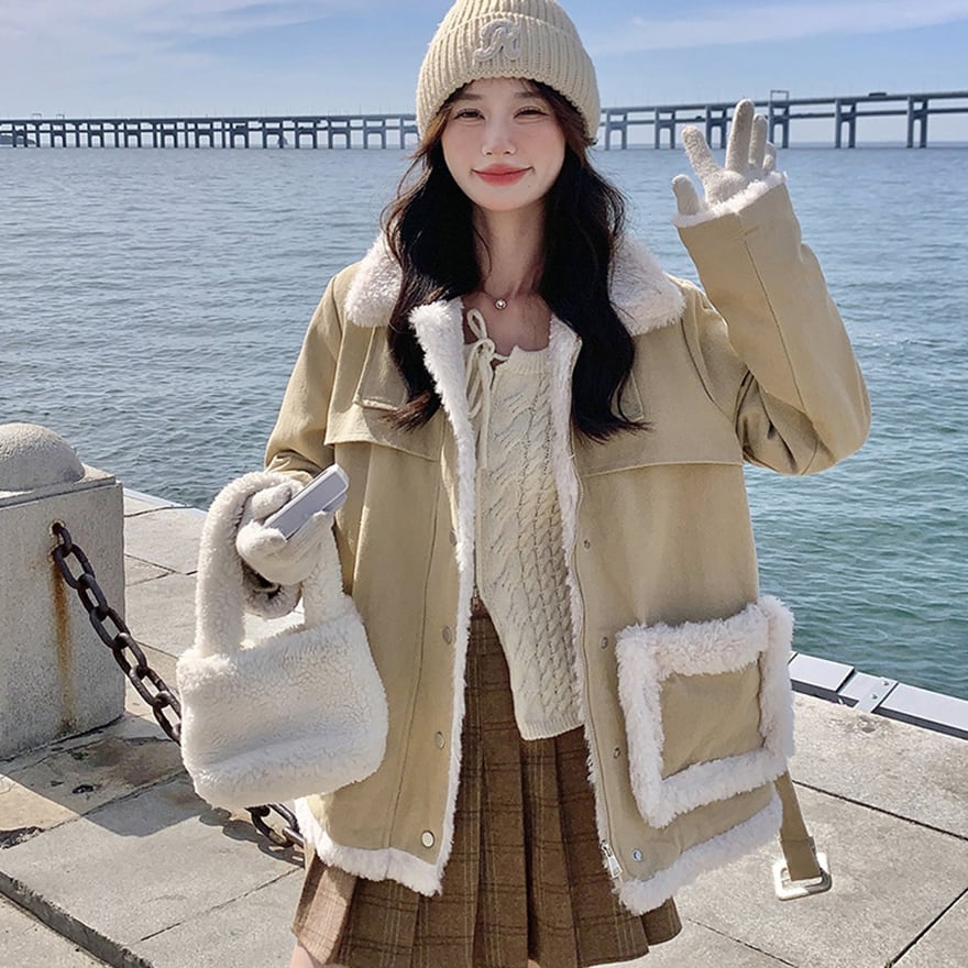 襟元や袖口、ポケットにあしらわれた、もこもこのボアが目を引くショート丈のジャケットです。