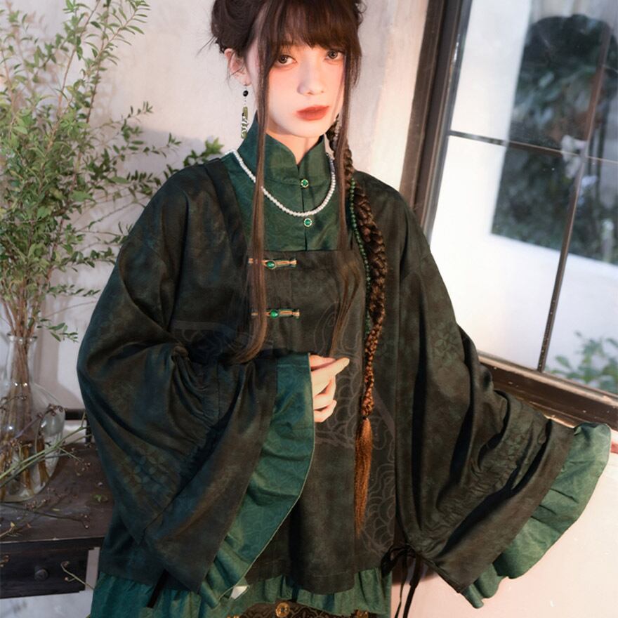 深い翠色がノーブルな印象を与える、サブカル系中華風トップスです。