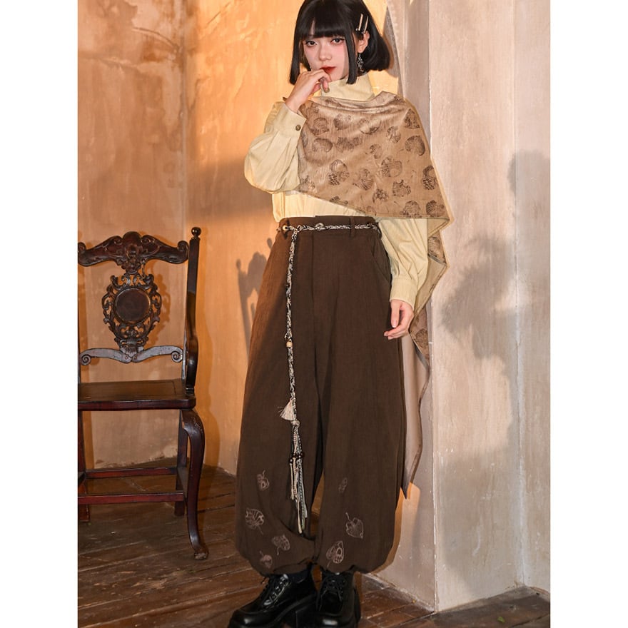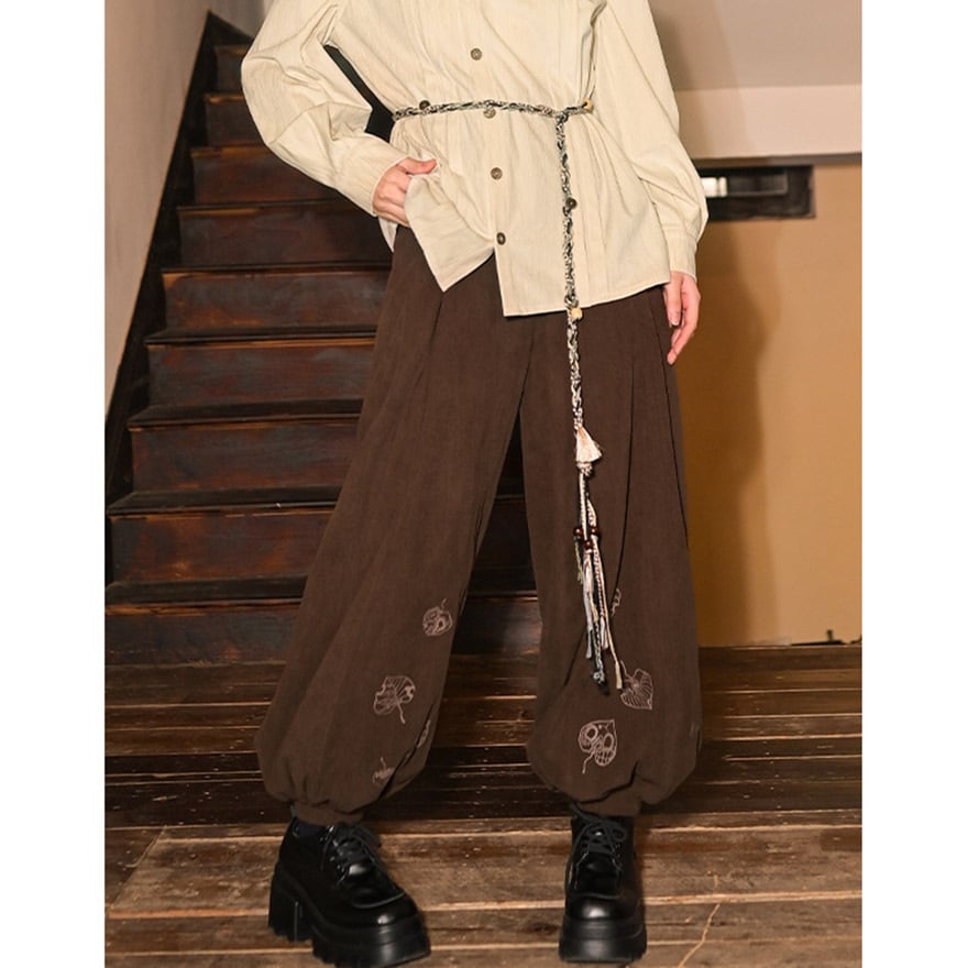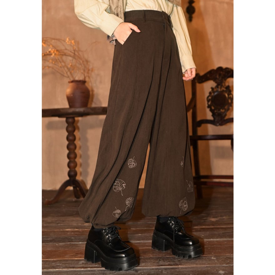 ゆったりとしたワイドなフォルムから、裾をきゅっと絞ったデザインが特徴的。裾にあしらわれた中華風のレトロな葉っぱの刺繍が、さりげないアクセントになっています。