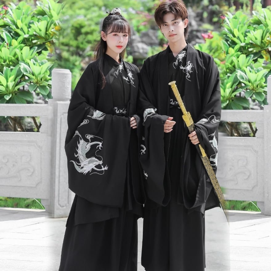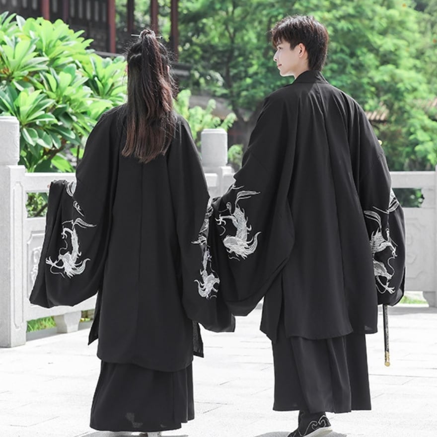 【即納L】中華ゴシック カップルコーデ 漢服 3点セット 着物風セットアップ ドラゴン刺繍