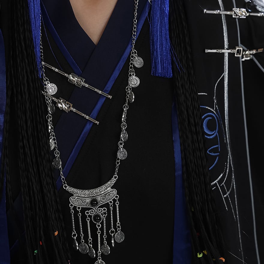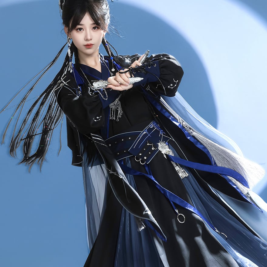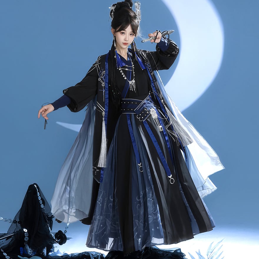夜空のような深い黒と青のグラデーションが美しい、フード付きのマント、トップス、スカート、ベルト、そしてネックレスまで揃った豪華なセットアップです。