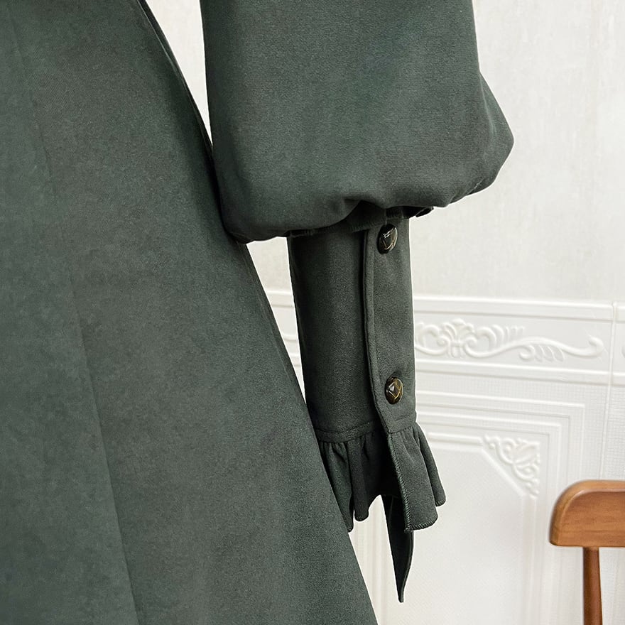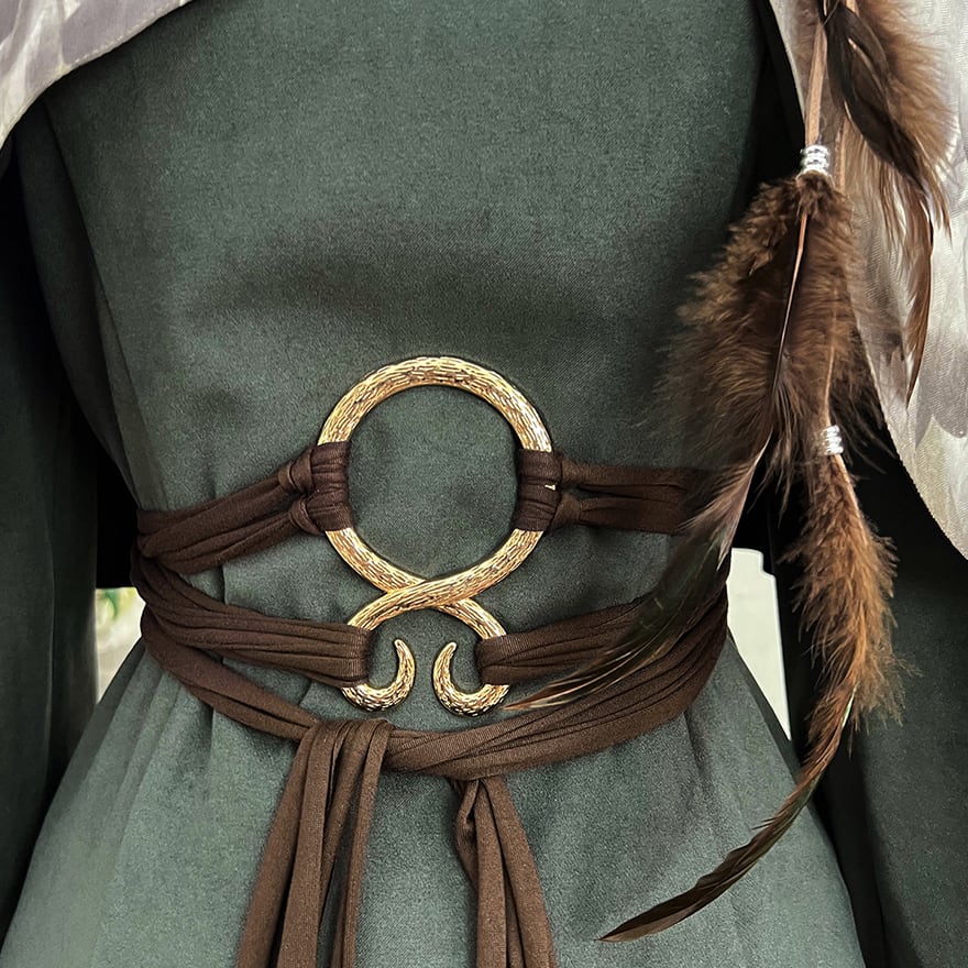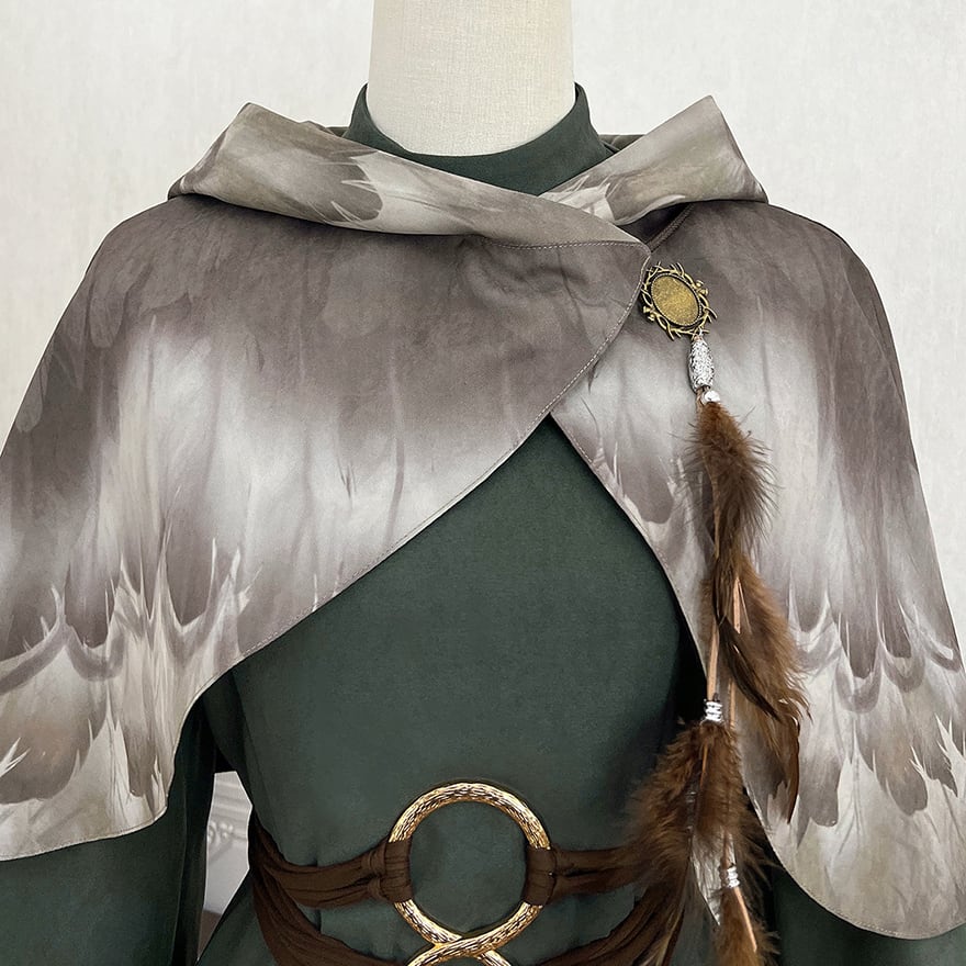 深みのあるフォレストグリーンのワンピースに、鳥の翼を模したフード付きケープ、レザー調のベルトがセットになった騎士風の衣装です。