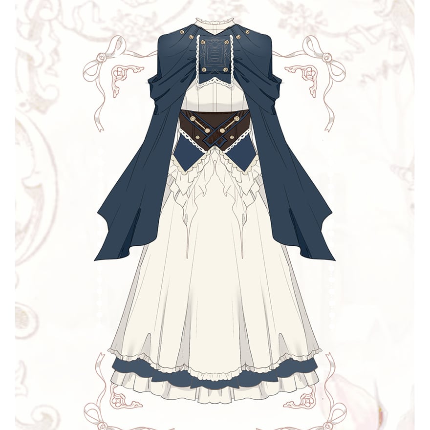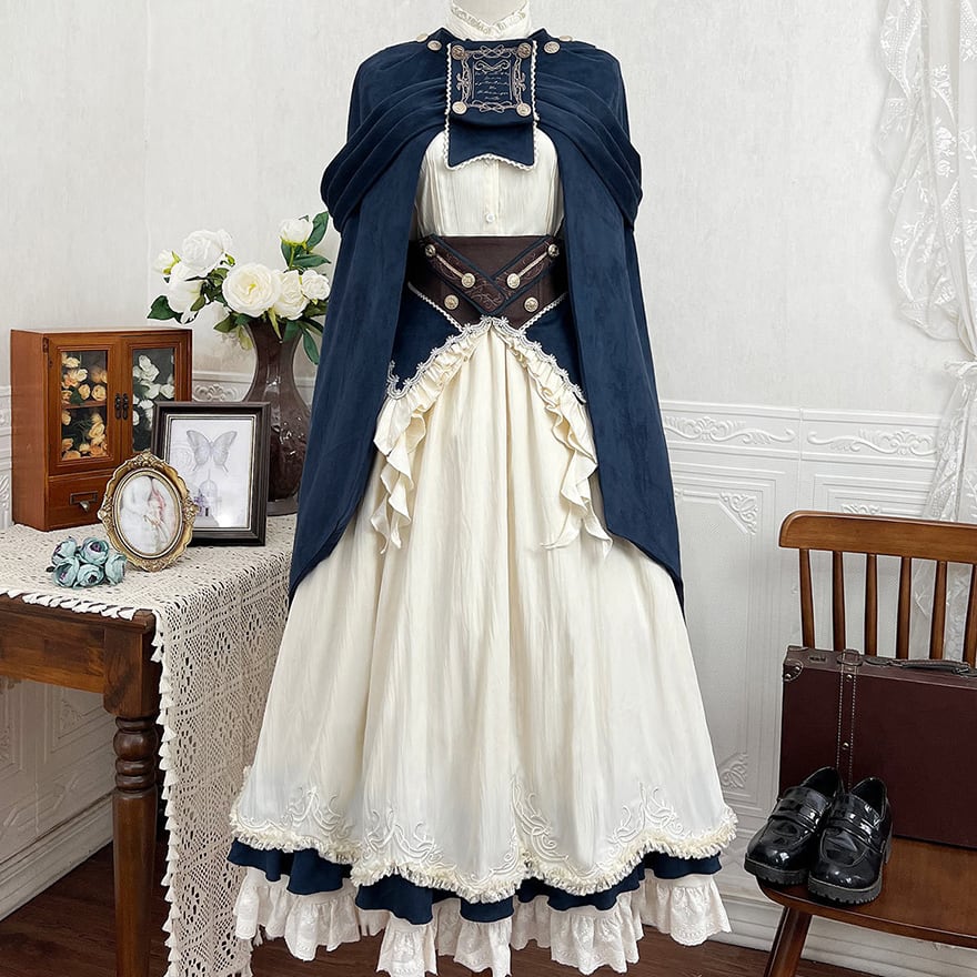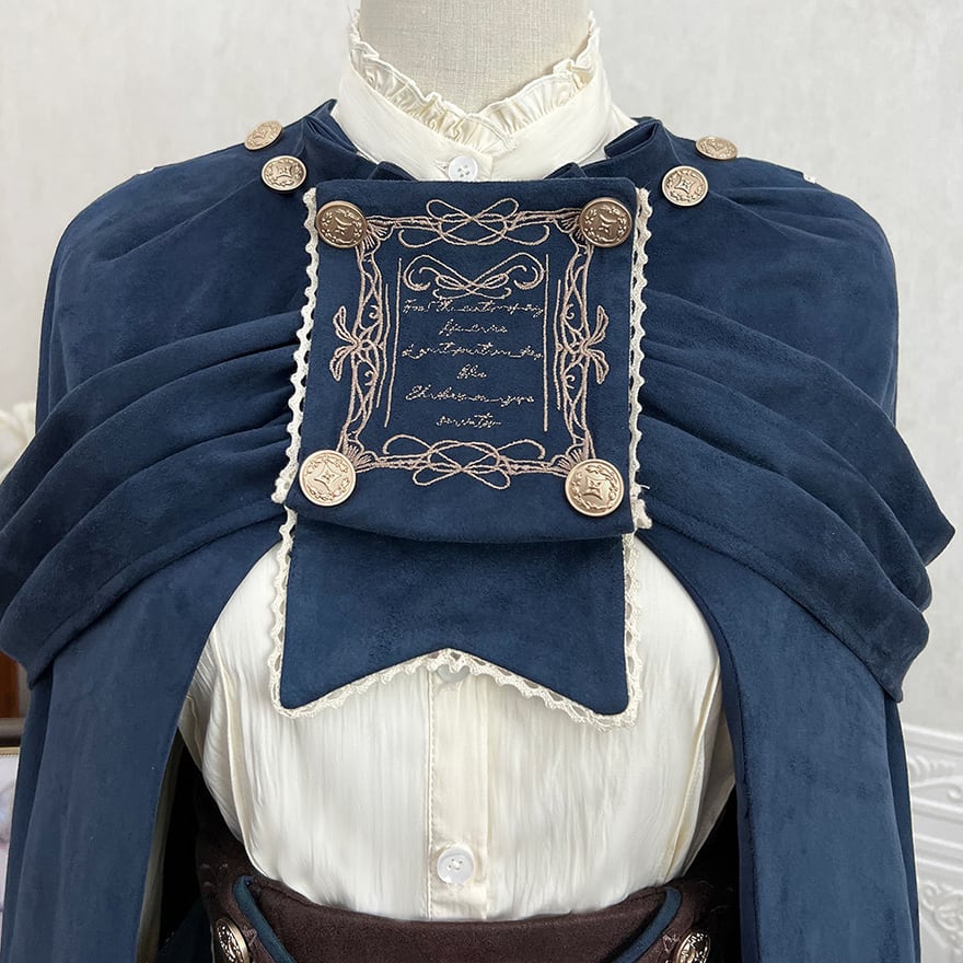 スエード調の気品あるケープは、胸元のアンティークゴールドの飾りがアクセント。スタンドカラーのブラウスと、裾に美しい刺繍とフリルが施されたボリューム感のあるスカートが、クラシカルな雰囲気を演出します。