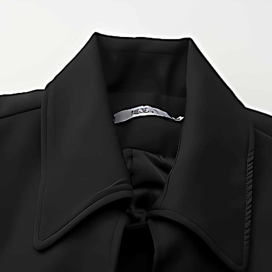 「無駄を削ぎ落とし、ディテールに宿る美意識を追求した一着。 特大のスプレッドカラー(広がる襟)と、アシンメトリーなケープバック(ストームシールド)が織りなす立体的なデザインは、どの角度から見てもアート作品のような完成度です。 ゆったりとしたオーバーサイズシルエットは、まるで彫刻のように身体を覆い、着る人にモードな威厳を与えます。 ウエストのベルトをラフに結んでボリュームを出すも良し、開けて内側のスタイリングを魅せるも良し。都会の冷たい空気の中で、あなたの存在感を際立たせるシャープな黒です。