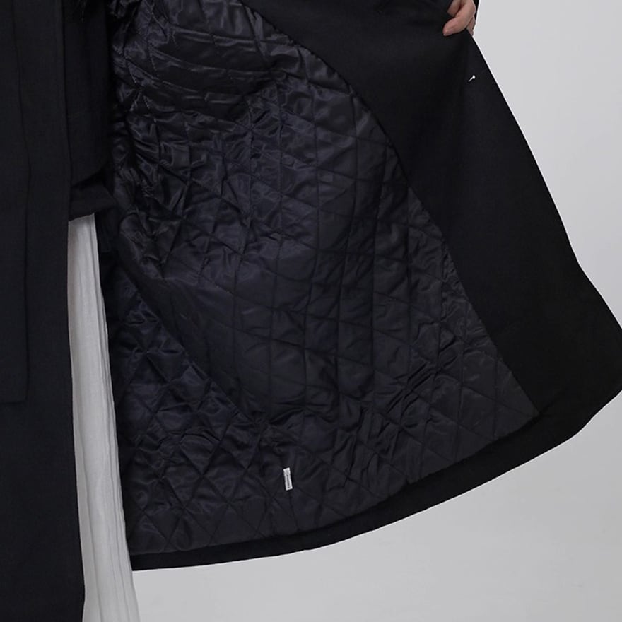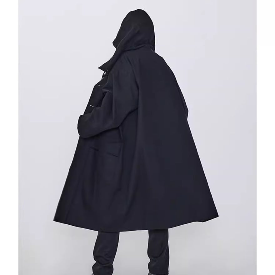 の常識に背を向けた、黒の哲学を体現する一着。 たっぷりとした生地が生み出す、重力に逆らわない優美なドレープは、着る人の動きに合わせて表情を変え、静と動のコントラストを表現します。 最大の特徴は、首元を完全に包み込むハイネックと一体化した大きなフード。全てを覆い隠すことで、都会の喧騒から自分だけの世界を守り抜きます。 比翼仕立てのようなミニマルなフロントと、あえて配置された大きなポケットのバランスが、退廃的な詩情を醸し出します。