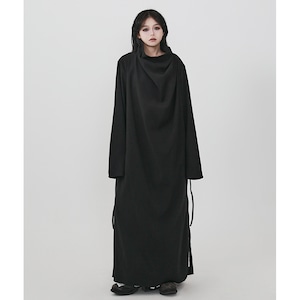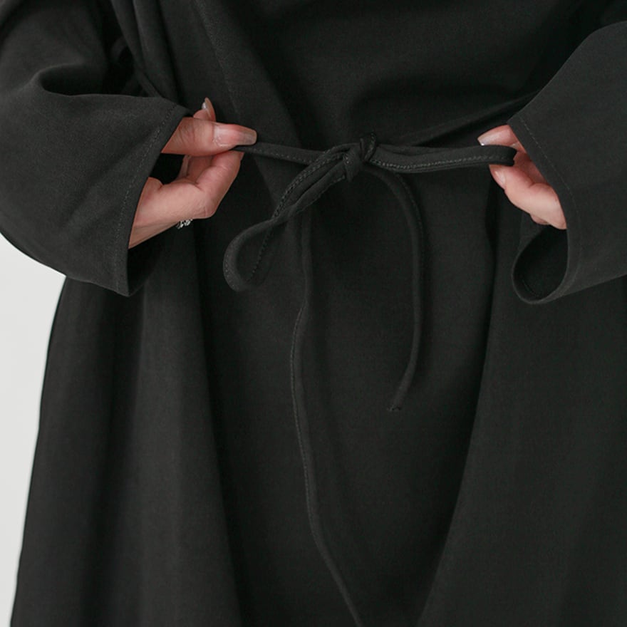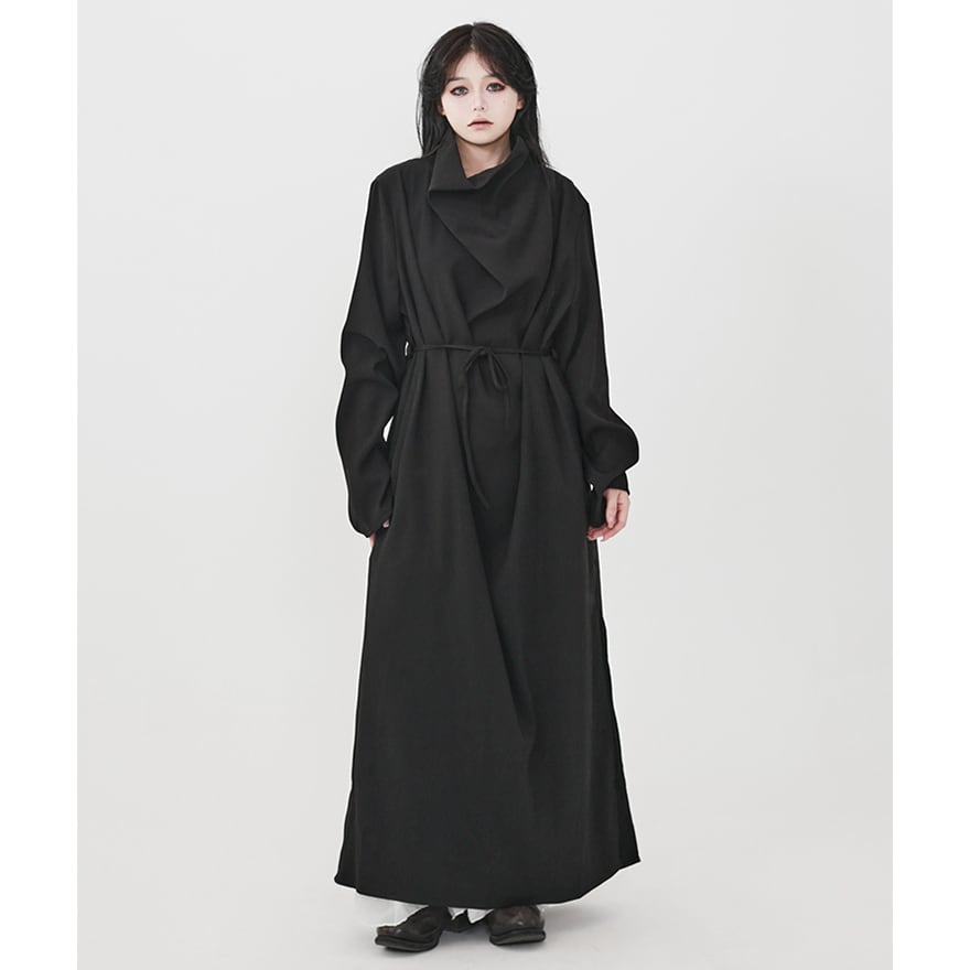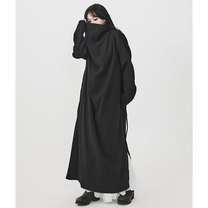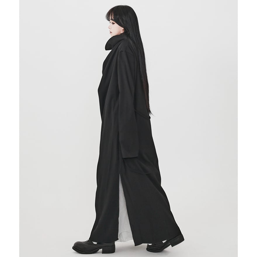 まるで影そのものを纏ったかのような、究極にミニマルなマキシ丈コート。 足首まで届く超ロング丈と、一切の装飾を排したデザインが、着る人に静かで強烈な存在感を与えます。 襟元は、顔半分を覆い隠すほどのドレープネックになっており、首元をしっかりとホールドしつつ、ミステリアスな表情を作り出します。 特筆すべきは、深く入ったサイドスリット。内側に着たボトムスやスカートの動きに合わせて揺れ、歩くたびにドラマティックな足元を演出します。無彩色で統一した着こなしで、研ぎ澄まされた黒の哲学を体現してください。