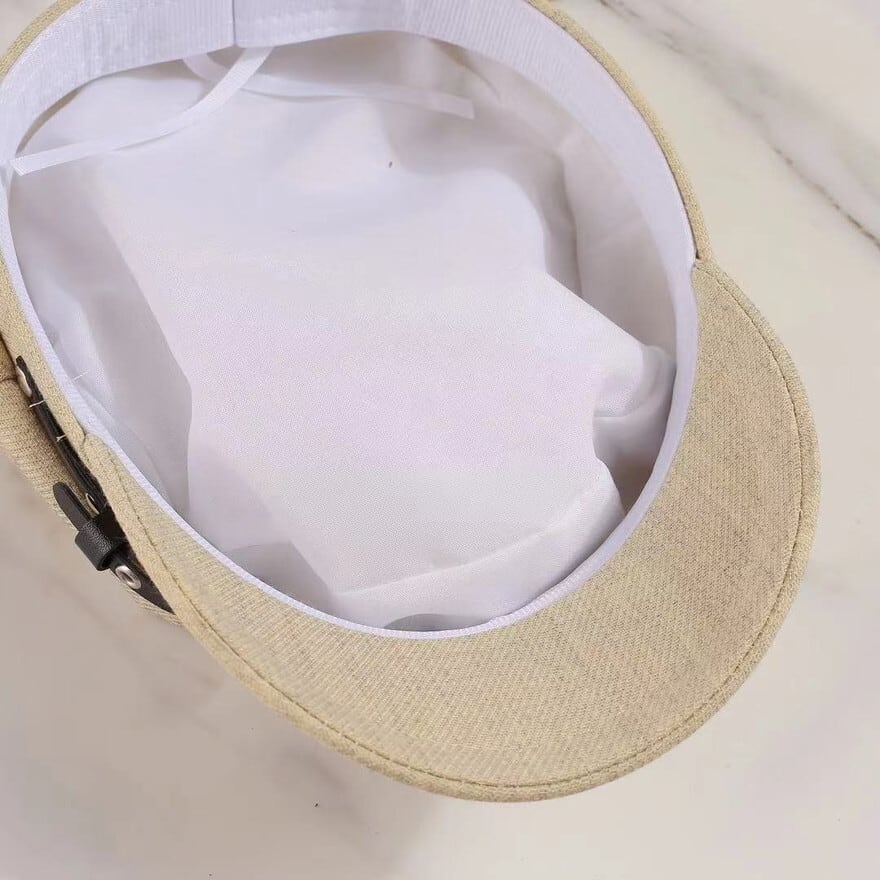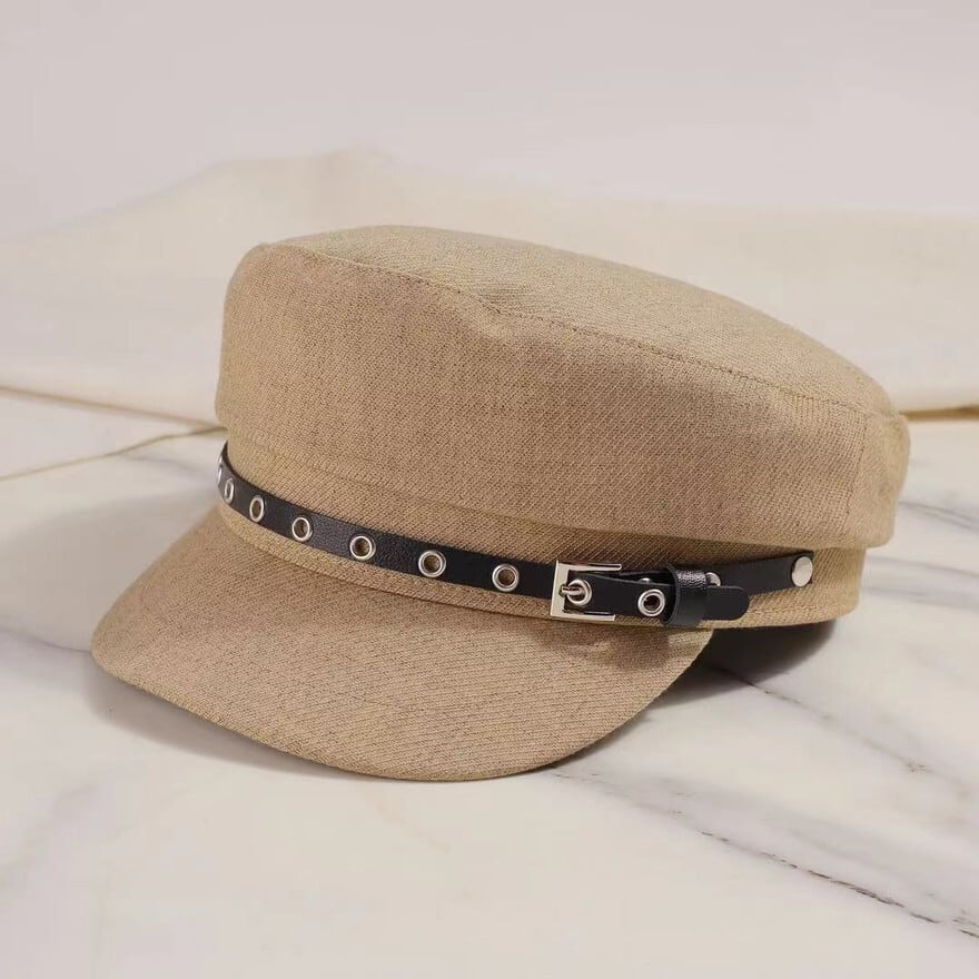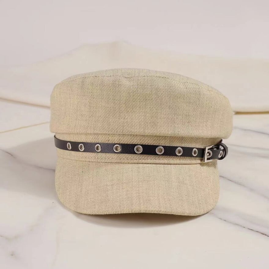 シンプルなシルエットにワンポイントのレザーバックルのキャスケットです
